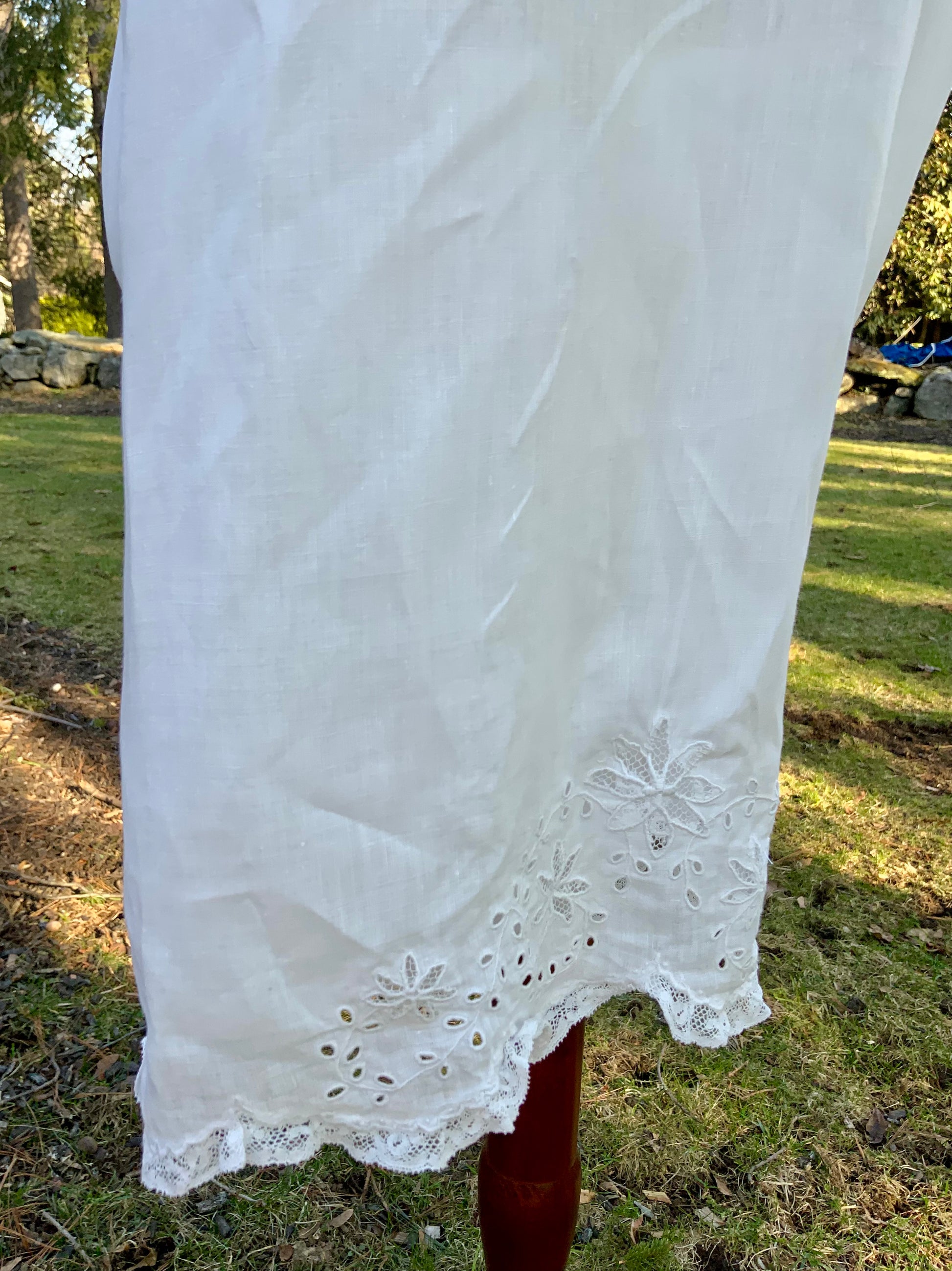 The hem is decorated with delicate hand embroidery and eyelet work forming floral motifs, finished with a fine scalloped edge and narrow lace trim. These decorative details added beauty to garments that were technically hidden but still made with great care and craftsmanship.