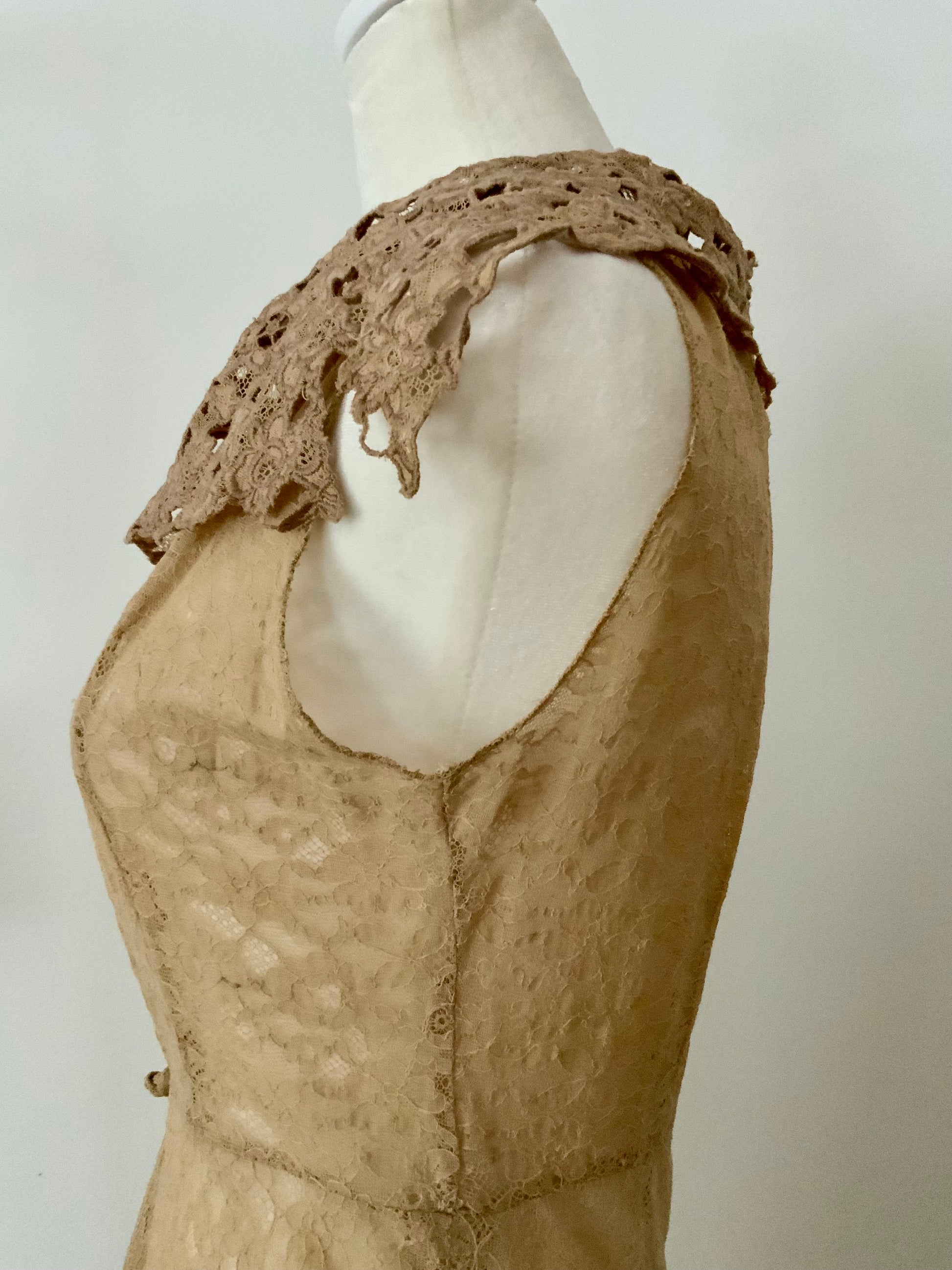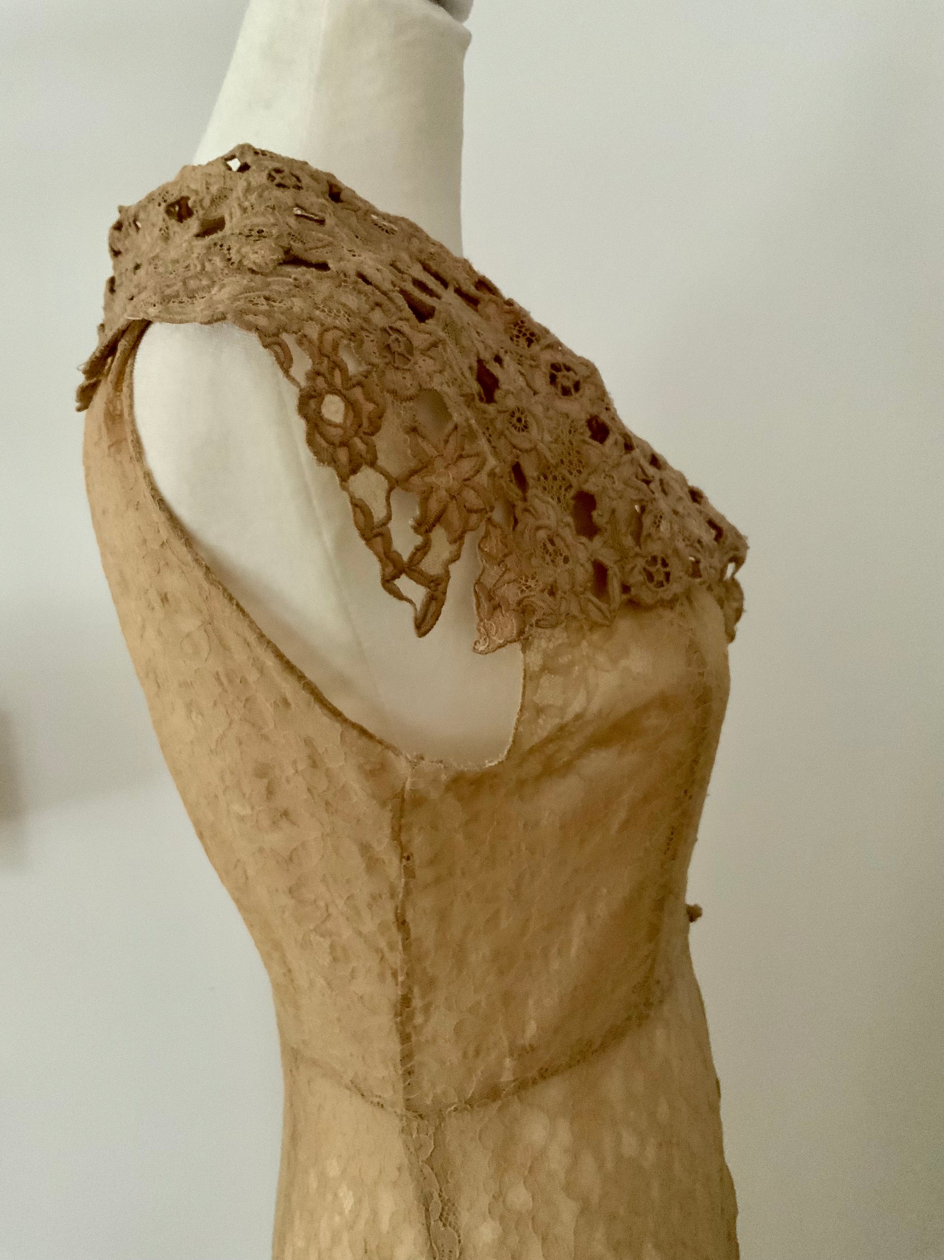 This piece was expertly designed as a lingerie over-dress, intended to be worn over a silk or fine cotton slip. The fitted bodice closes with original fabric-covered buttons and hand-worked loop closures, while delicate crochet lace appliqué forms soft cap-like shoulders and a graceful neckline.