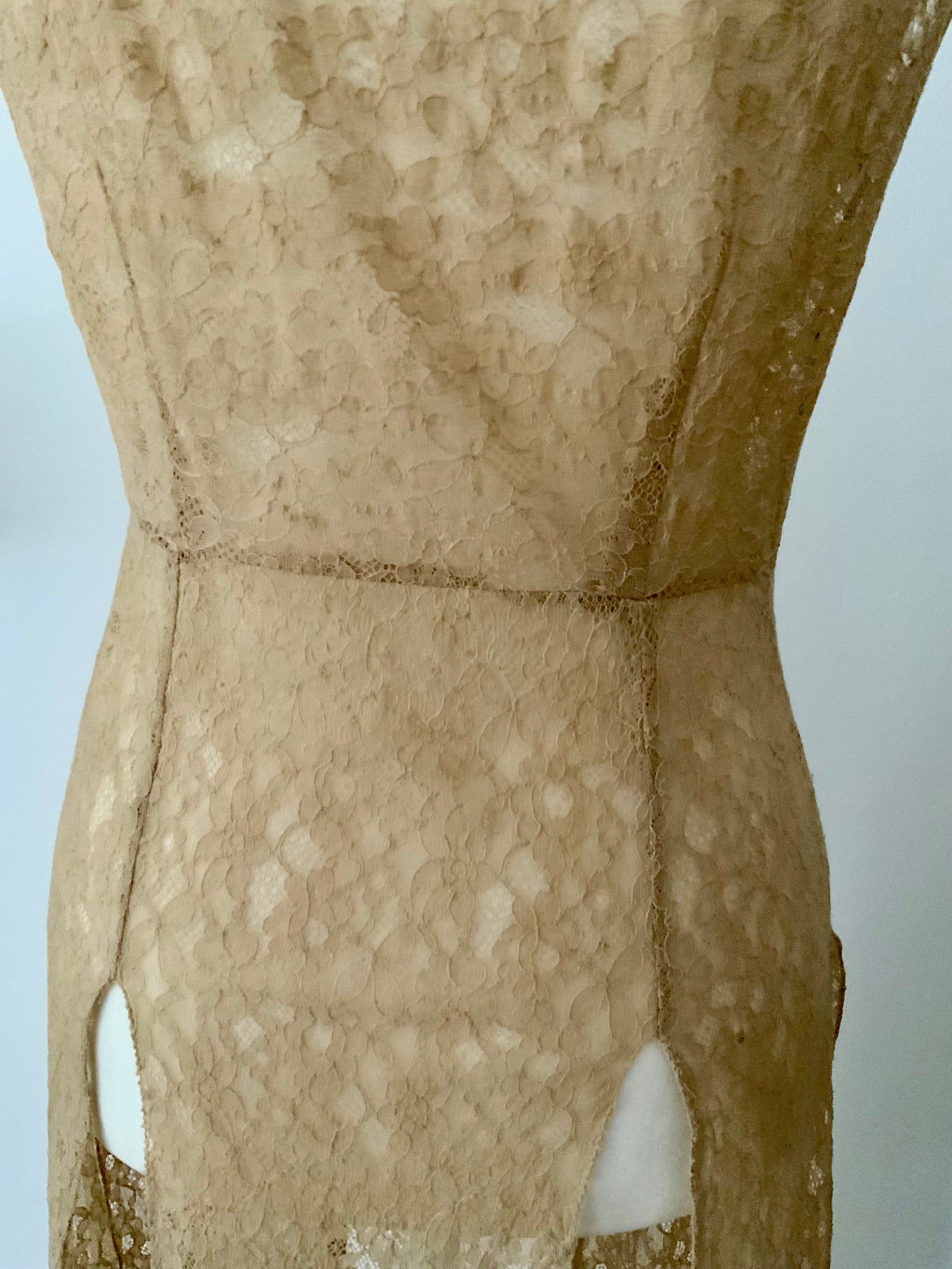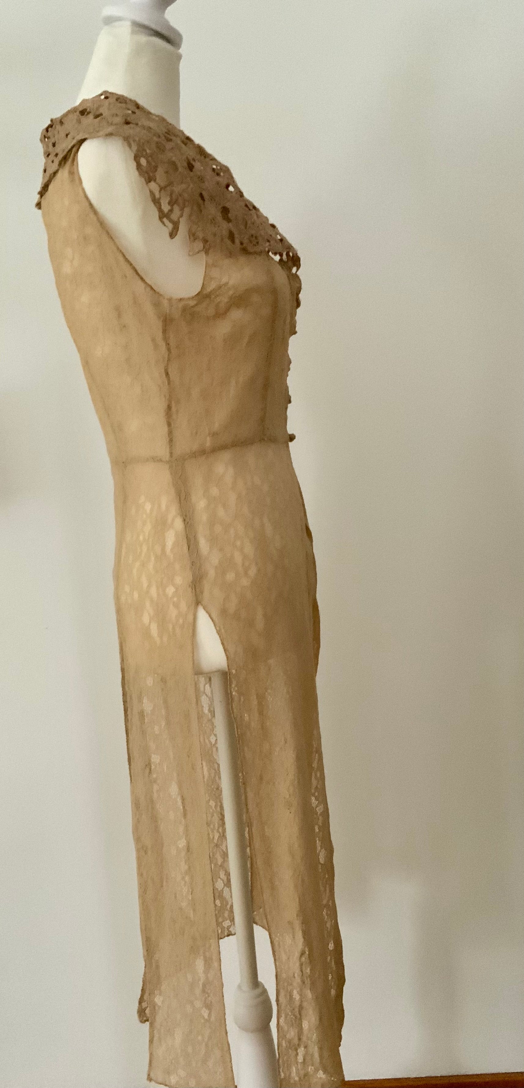 In its time, this overdress would have been layered over a pale silk or lawn slip and worn for afternoon tea, private entertaining, or resort wear. The multi-panel design was intentional: it revealed the underlayer subtly, emphasizing elegance rather than exposure, and was meant to be admired in motion.