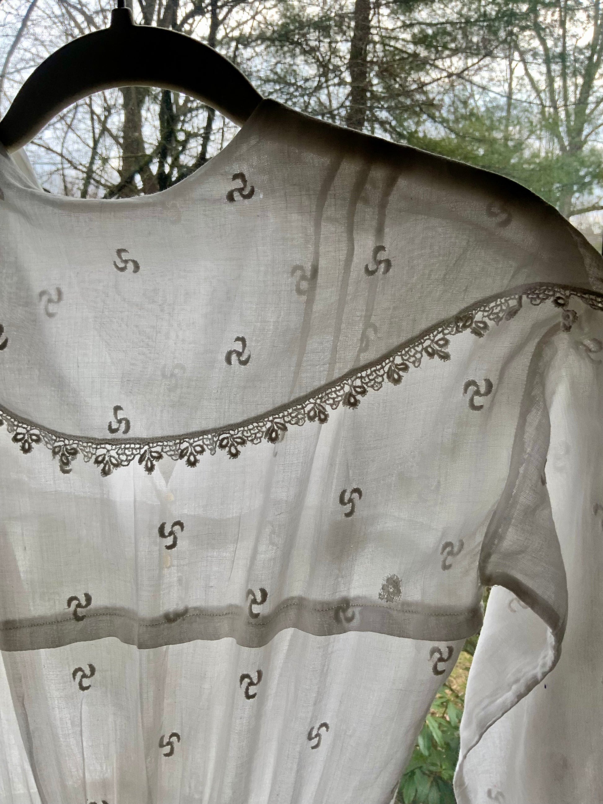 An exquisite early 20th century lingerie dress, dating from approximately 1915–1925, crafted in an ethereal sheer cotton voile delicately embroidered with a subtle all-over tonal scroll motif.