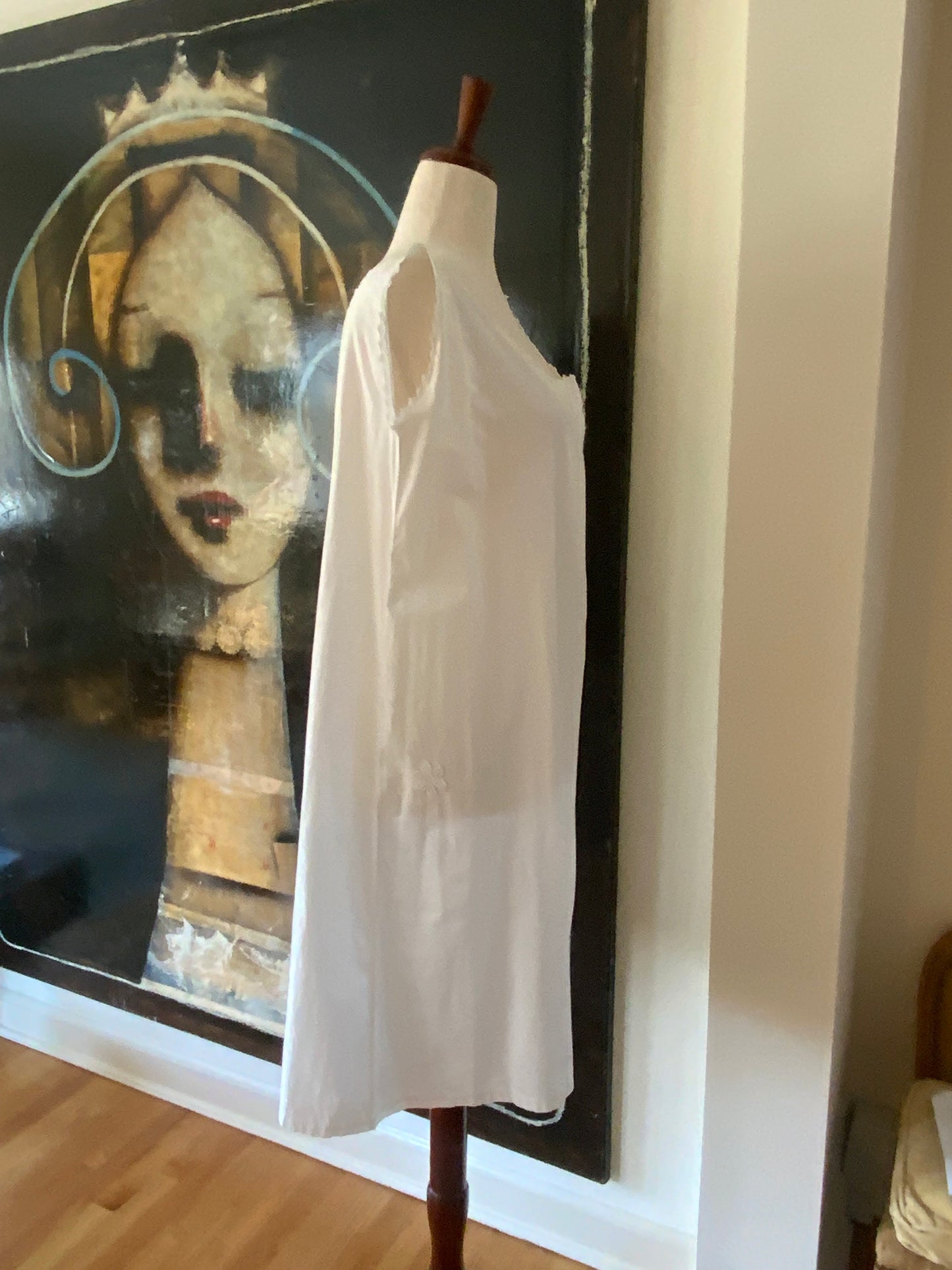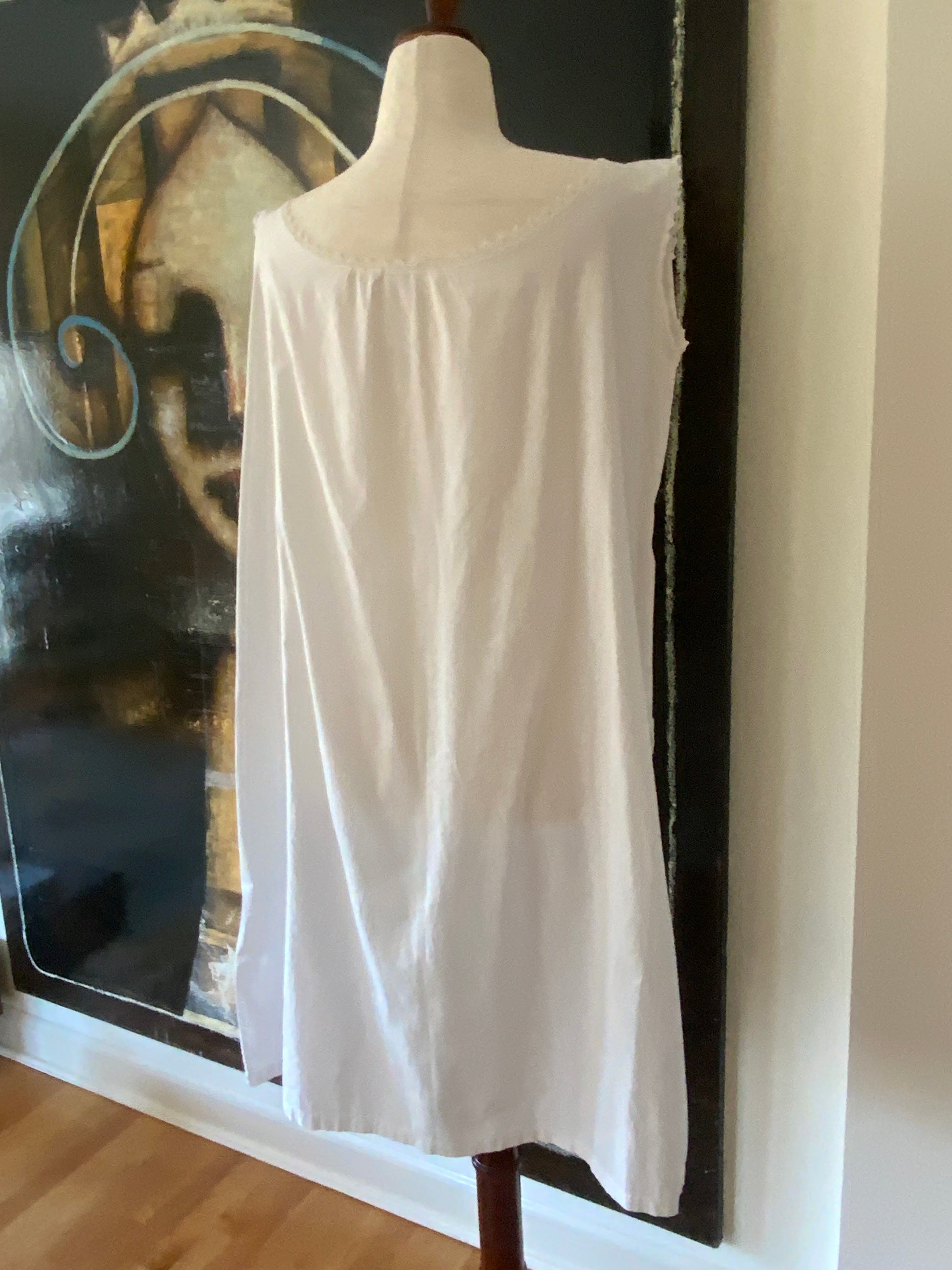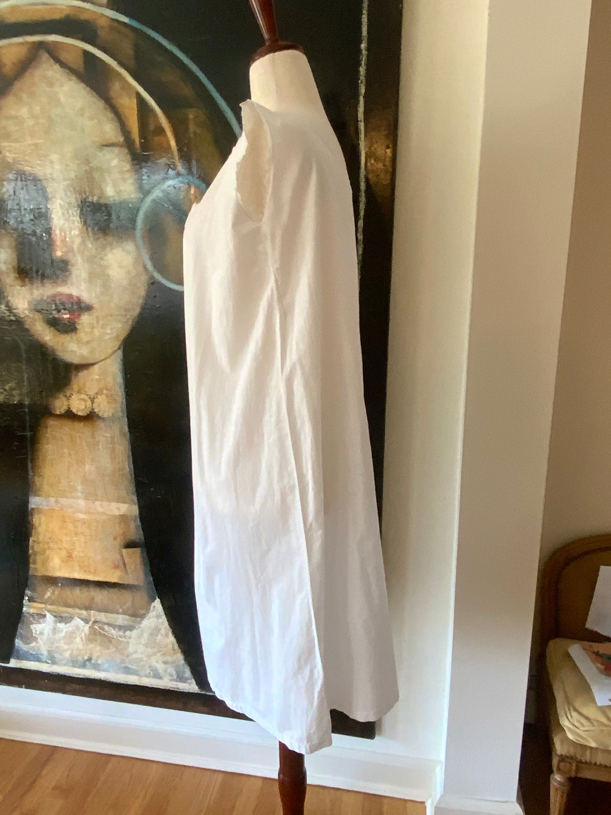 This exquisite Edwardian white cotton slip is a true testament to timeless craftsmanship, featuring delicate embroidery and cutwork on the chest. Made from airy, soft cotton, it offers both comfort and elegance. Once worn as a nightgown, this piece now transitions effortlessly into modern wear—whether as a breezy lounge dress, a chic summer staple, or a dreamy beach cover-up.