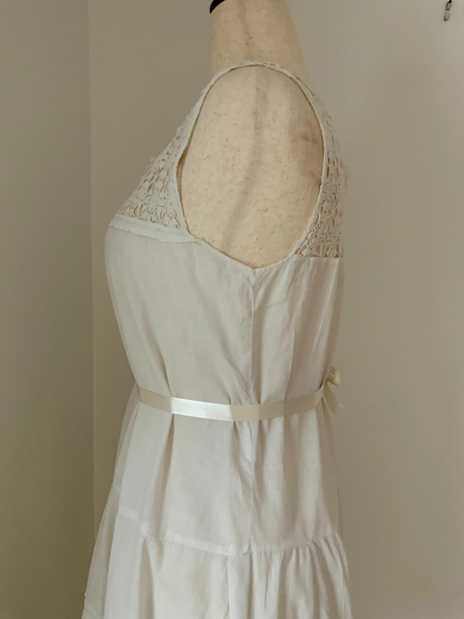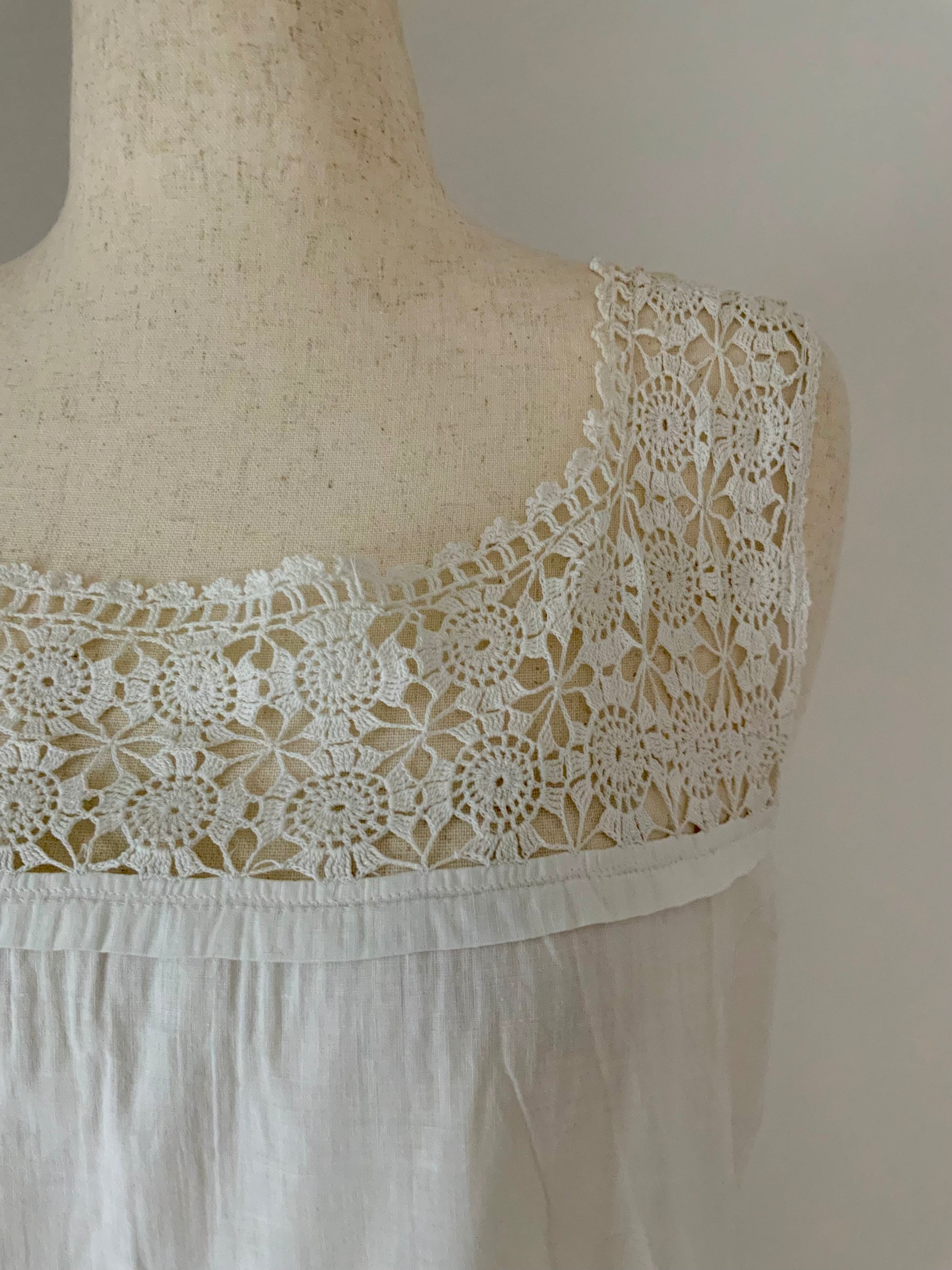 This piece is crafted from fine semi-sheer cotton voile with a beautifully detailed crochet lace yoke featuring intricate floral motifs. The silhouette falls softly from the shoulders into a relaxed drop waist, finished with tiered panels and horizontal lace insertions along the lower