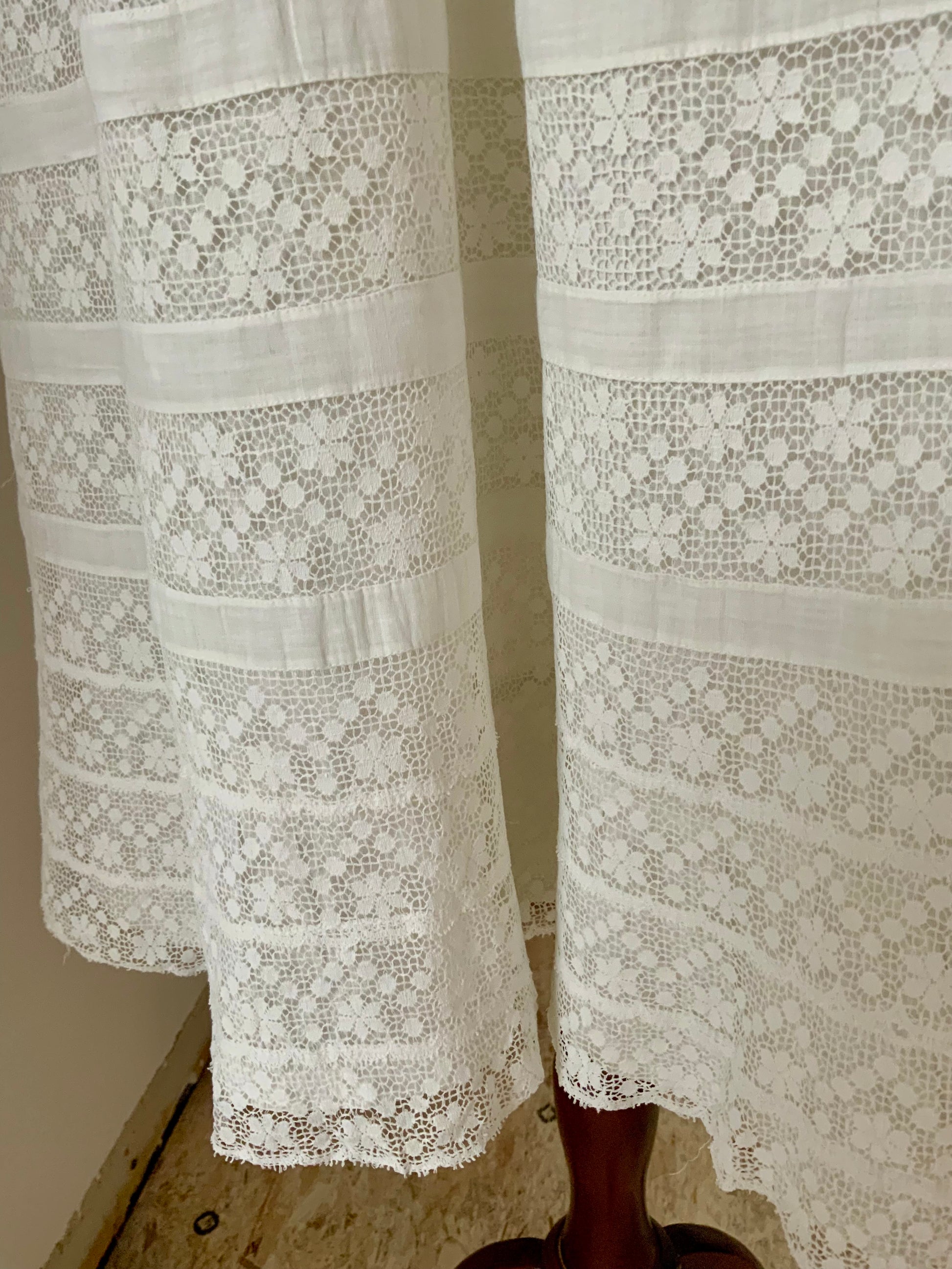 The tone is a soft antique ivory, consistent with age. The dress remains in very good antique condition with strong lace integrity and no significant structural damage. As with most lingerie dresses of this era, it is semi-sheer and intended to be worn over a separate slip.