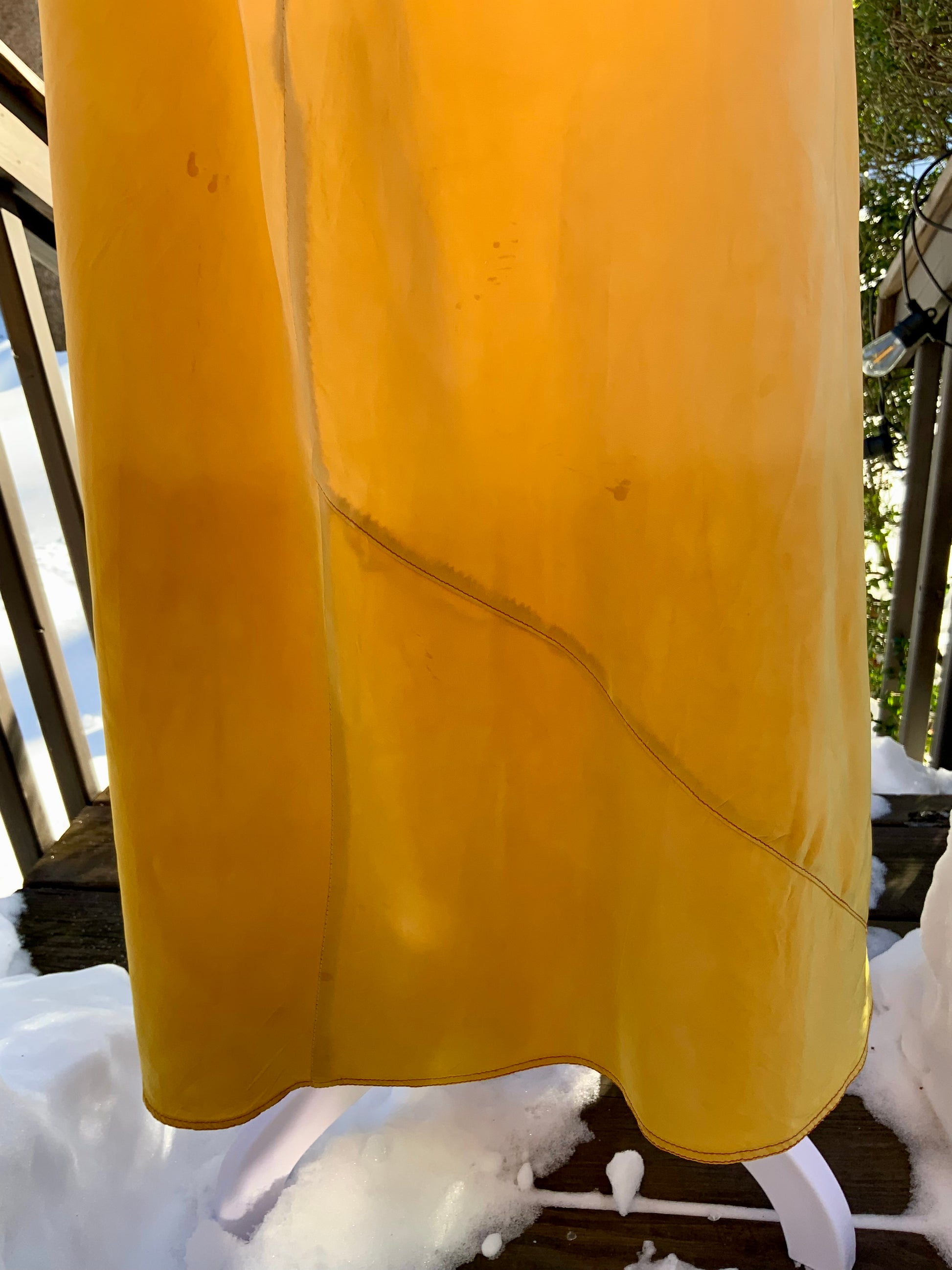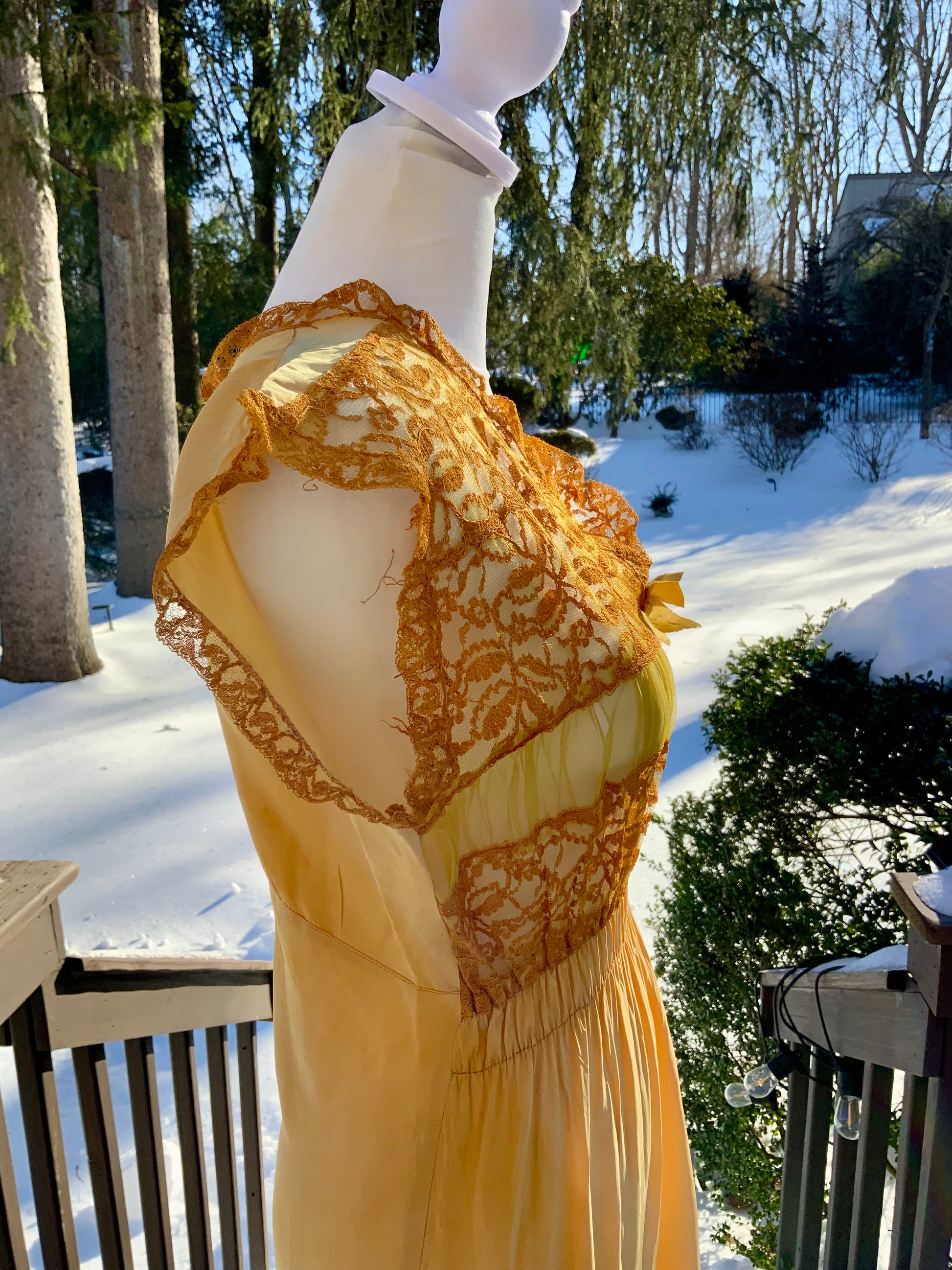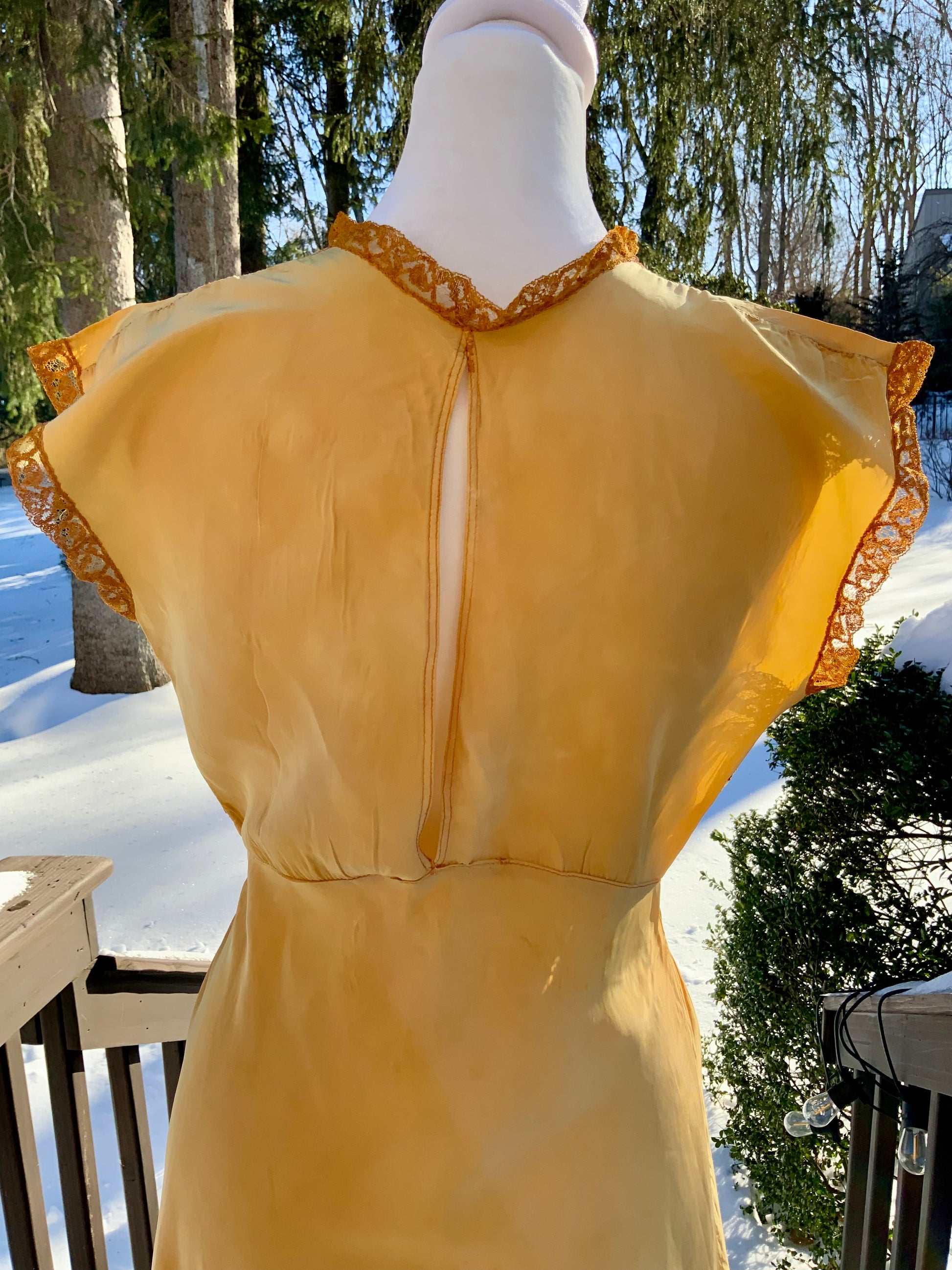 A rare original late 1930s to early 1940s silk nightgown, carefully  hand-dyed in a luminous golden-yellow hue. This romantic piece features a delicate lace bodice and cap sleeves, a softly gathered waist, and a flowing floor-length skirt that moves beautifully with the body.