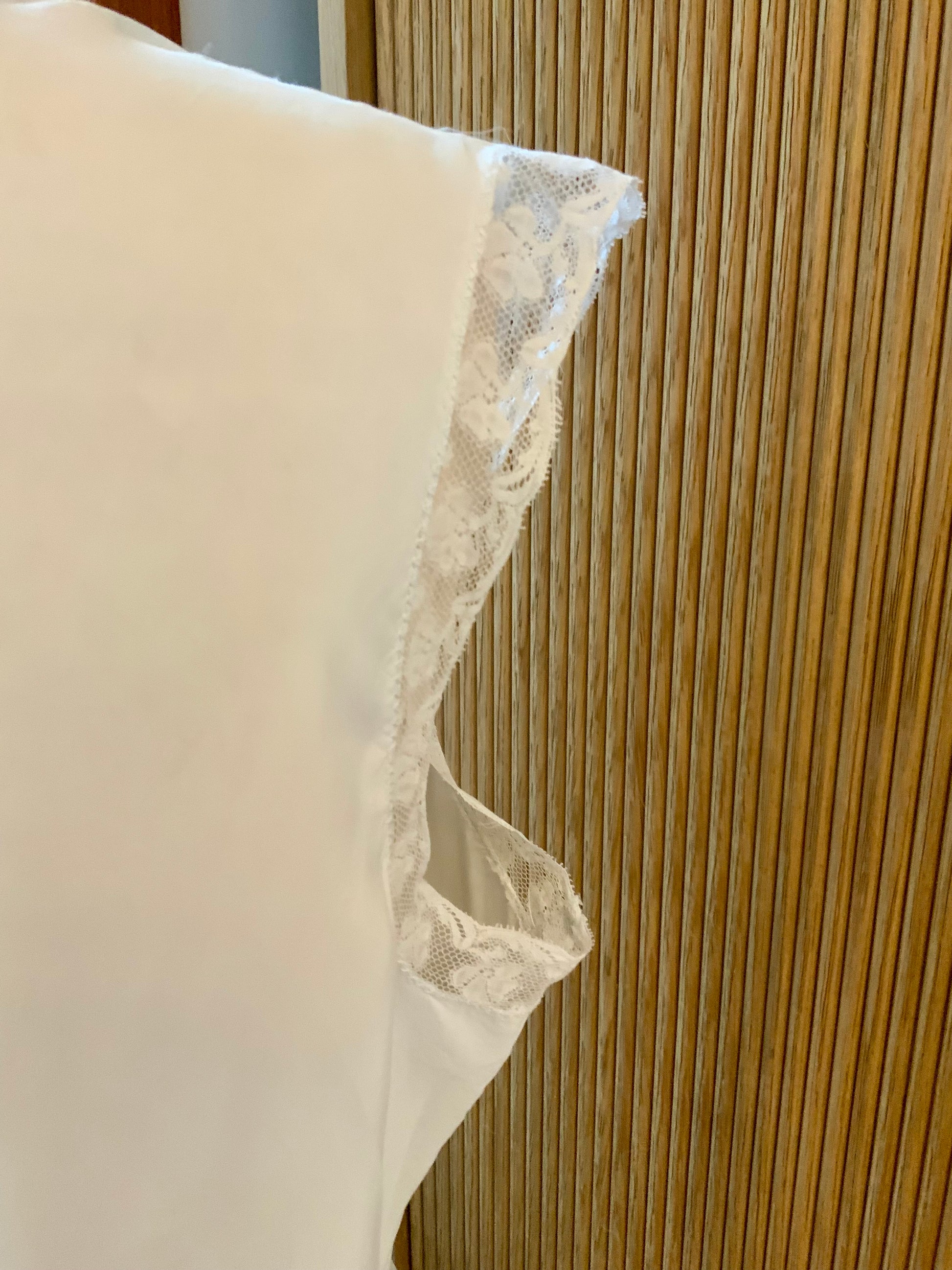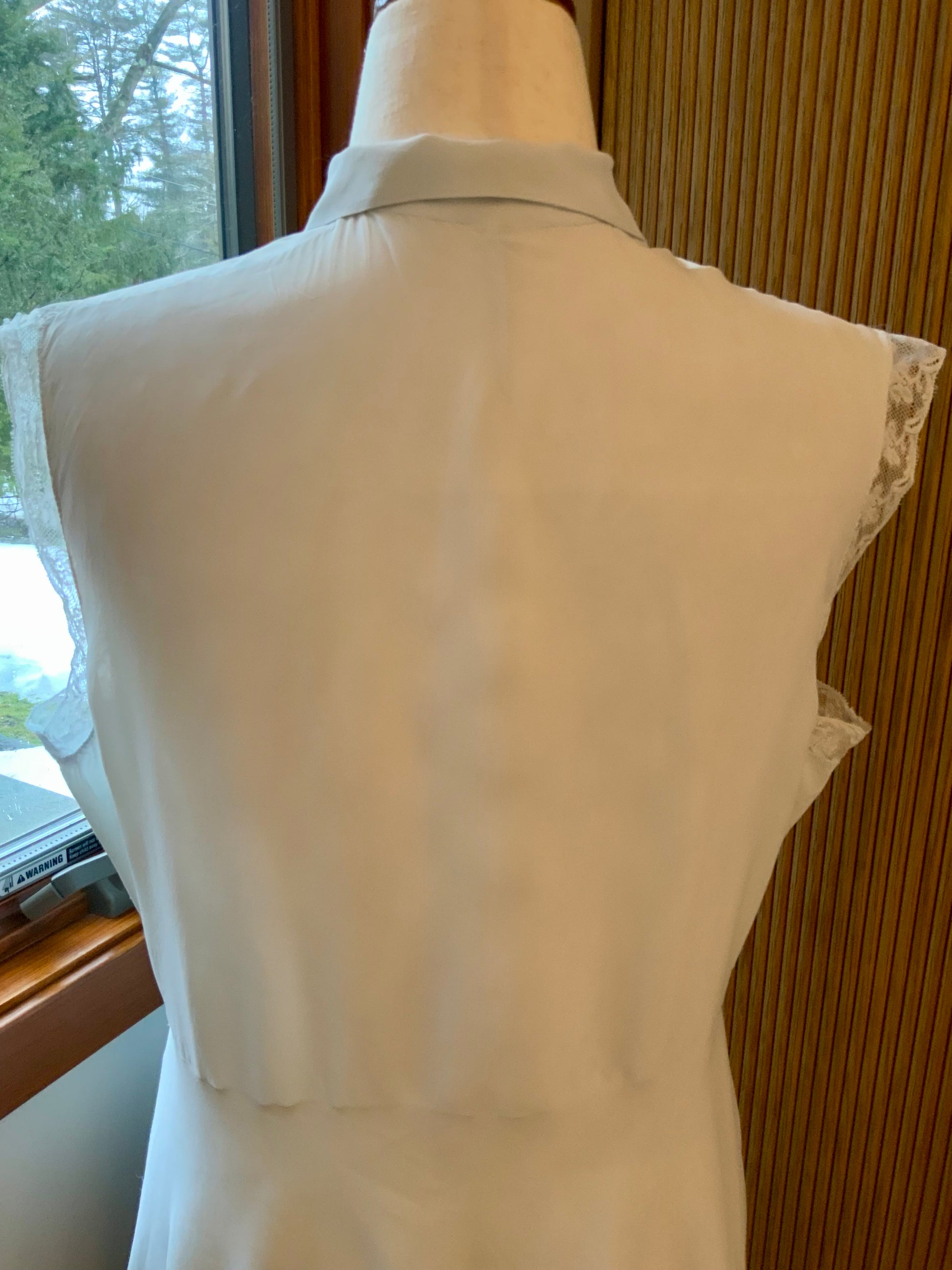 Sleeveless shoulders are finished with delicate lace edging adding softness while maintaining the clean architectural lines typical of late 1930s design