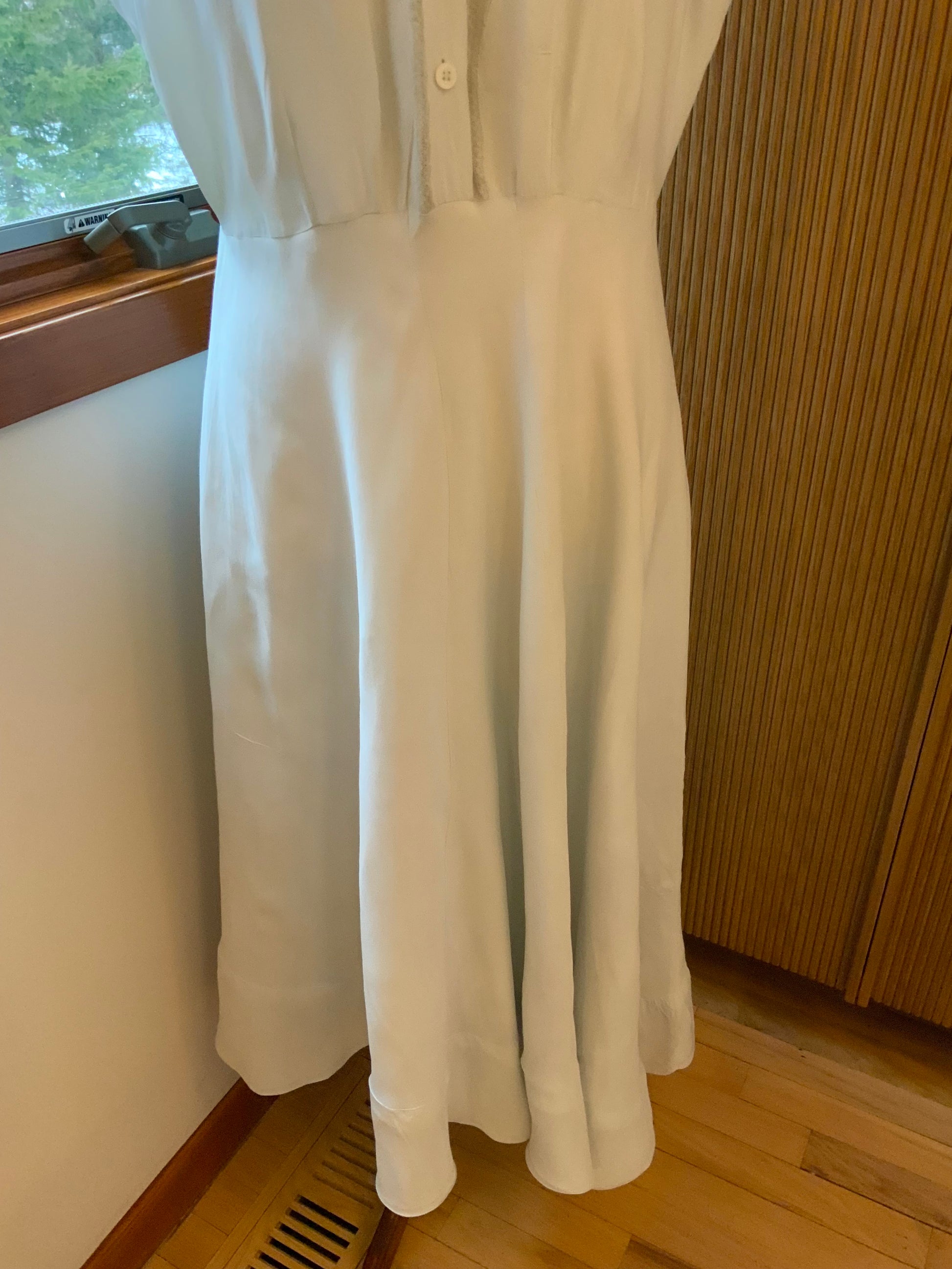 The dress has been carefully restored and remains in wearable condition One tiny pinhole near the back button has been discreetly covered and reinforced I added a narrow satin ribbon at the waist to stabilize the area while preserving the integrity of the garment