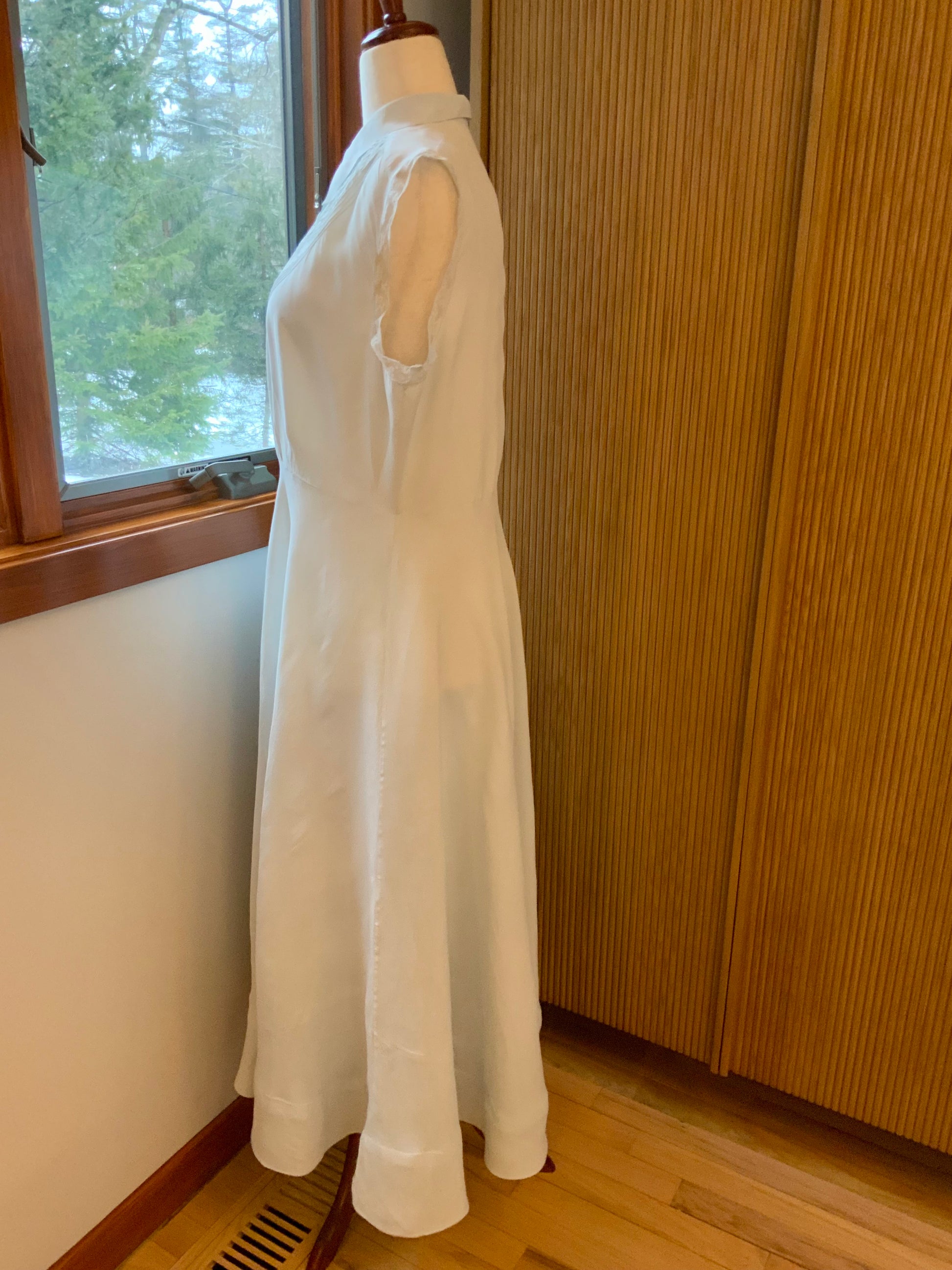 This elegant piece reflects the refined femininity of pre war fashion combining delicate lingerie inspired details with tailored daywear structure The bodice features a small collar button front closure and a beautifully constructed V shaped panel of pintucks with lace insertion
