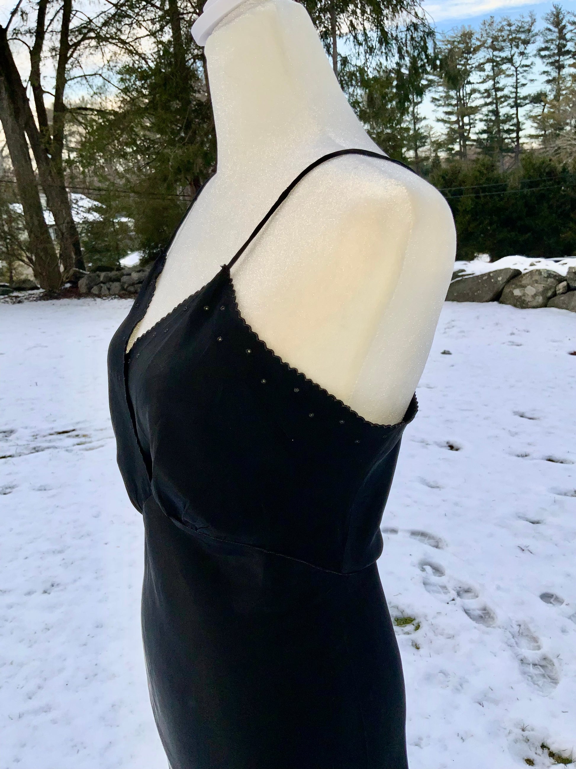 A rare and beautifully preserved late 1930s to early 1940s black silk slip, cut entirely on the bias for fluid movement and an elegant, body-skimming silhouette.