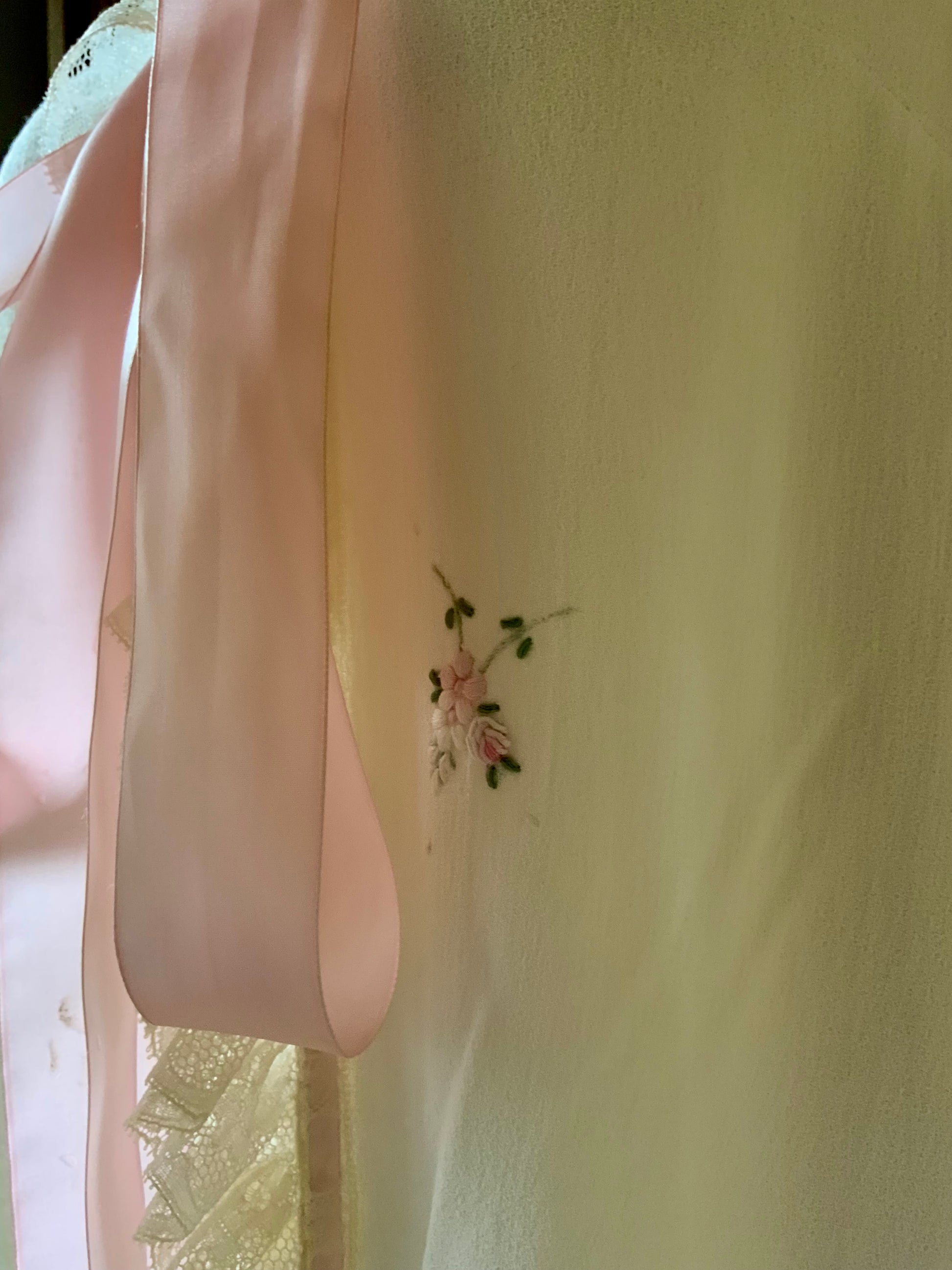 1950s Vintage Nylon Crepe Peignoir Robe Lace Ribbon Embroidered Boudoir Lingerie-50BF