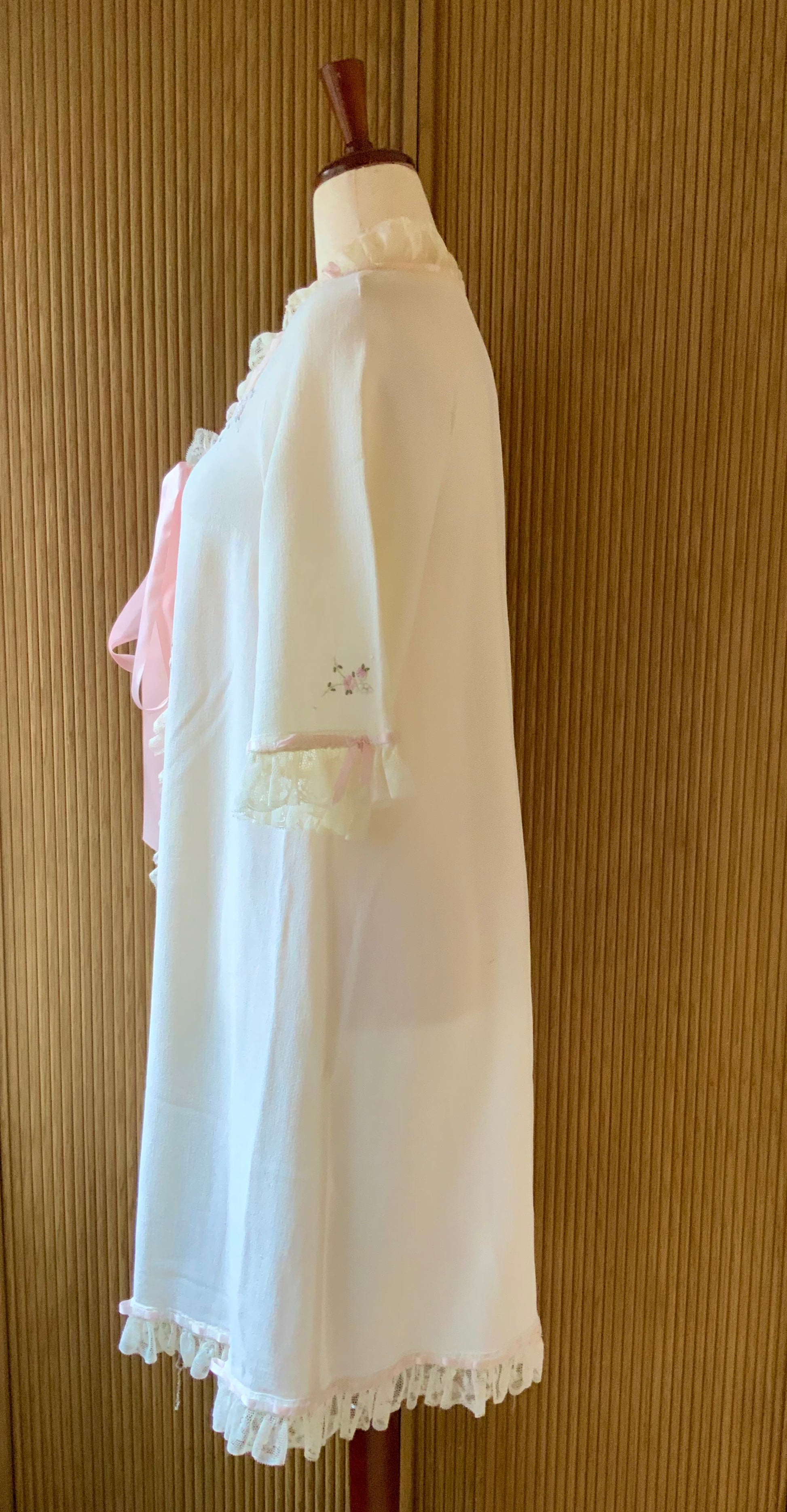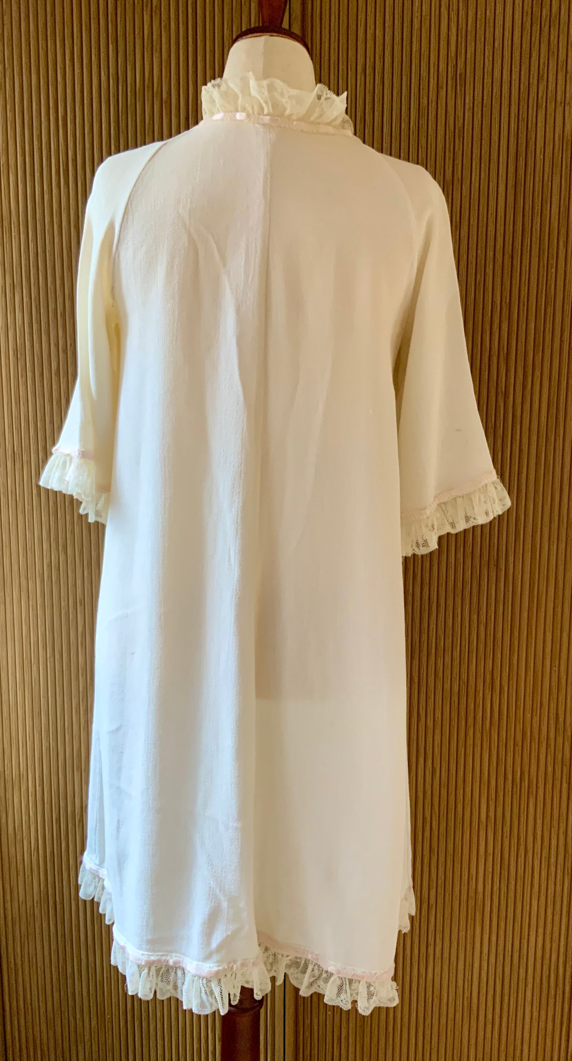 Beautiful vintage peignoir robe dating to the late 1950s to early 1960s, crafted in soft nylon crepe with delicate romantic detailing.