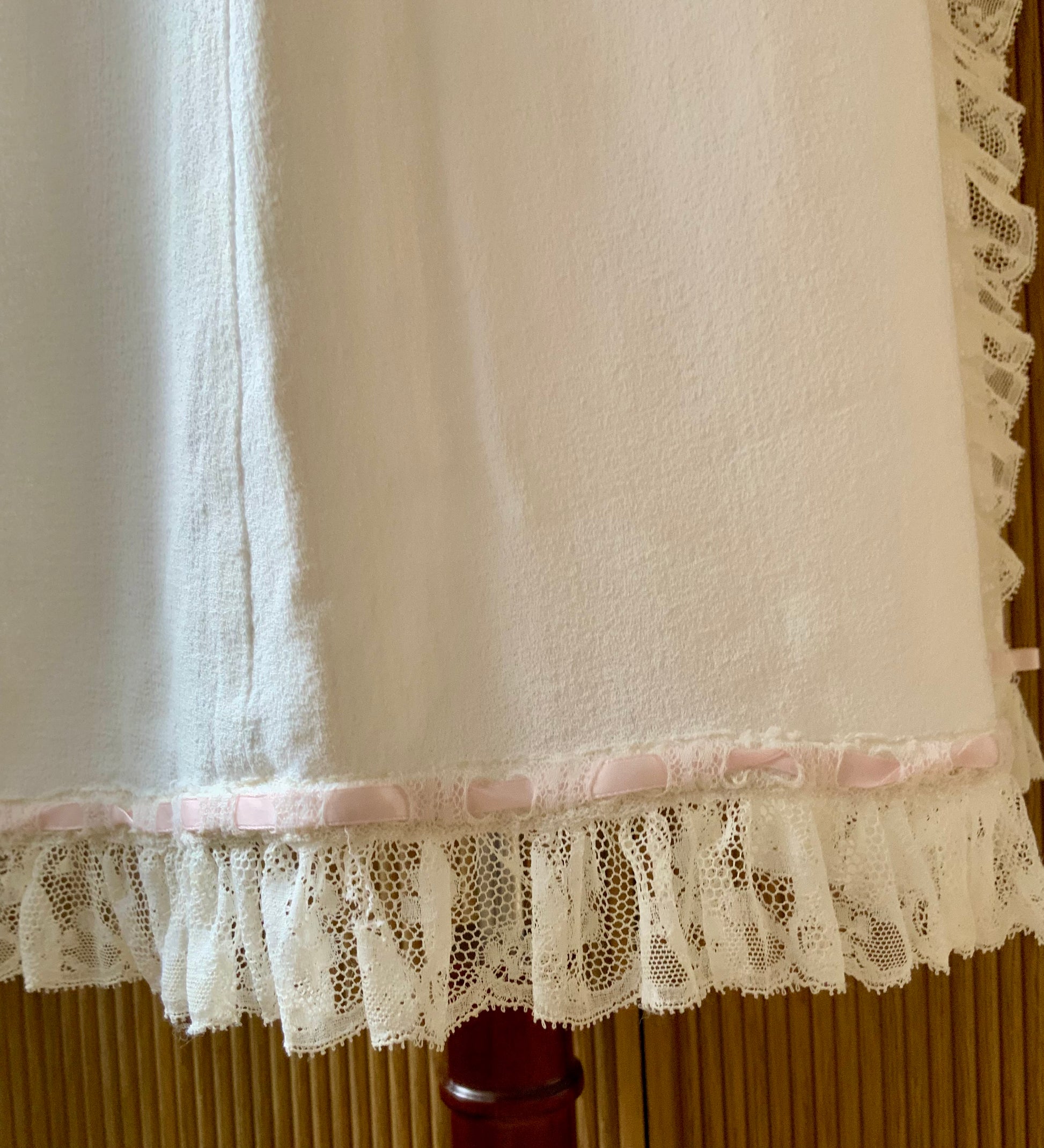 The sleeves and hem are finished with lace ruffles threaded with pale pink ribbon, creating soft movement and an elegant romantic look.