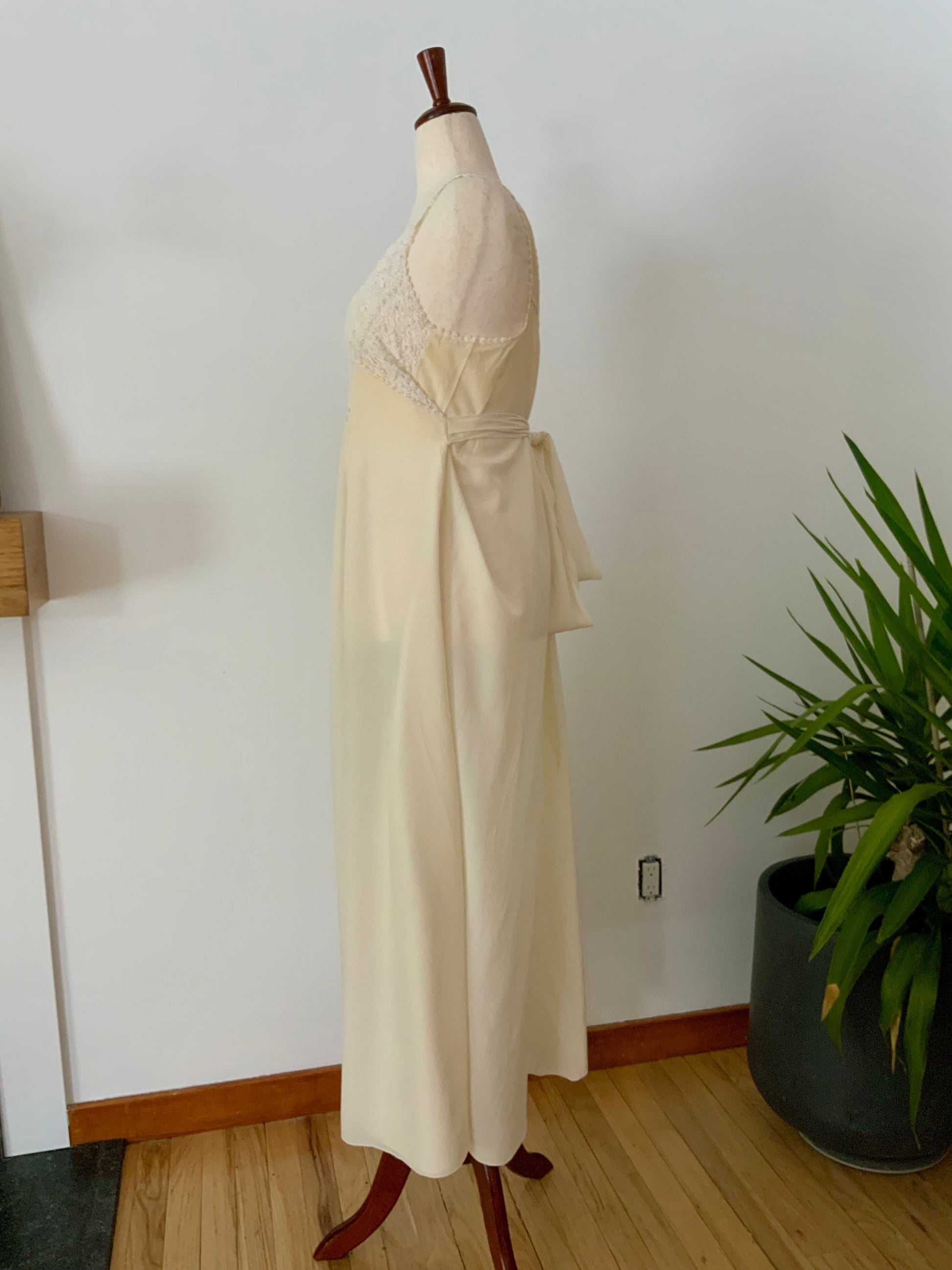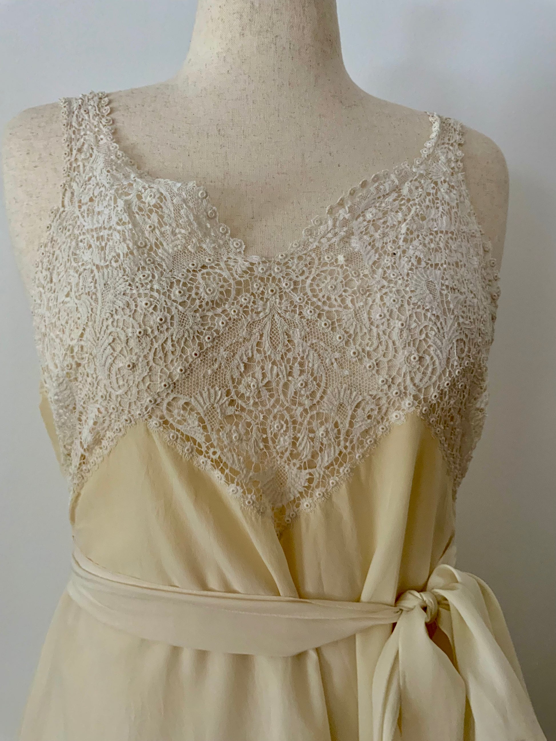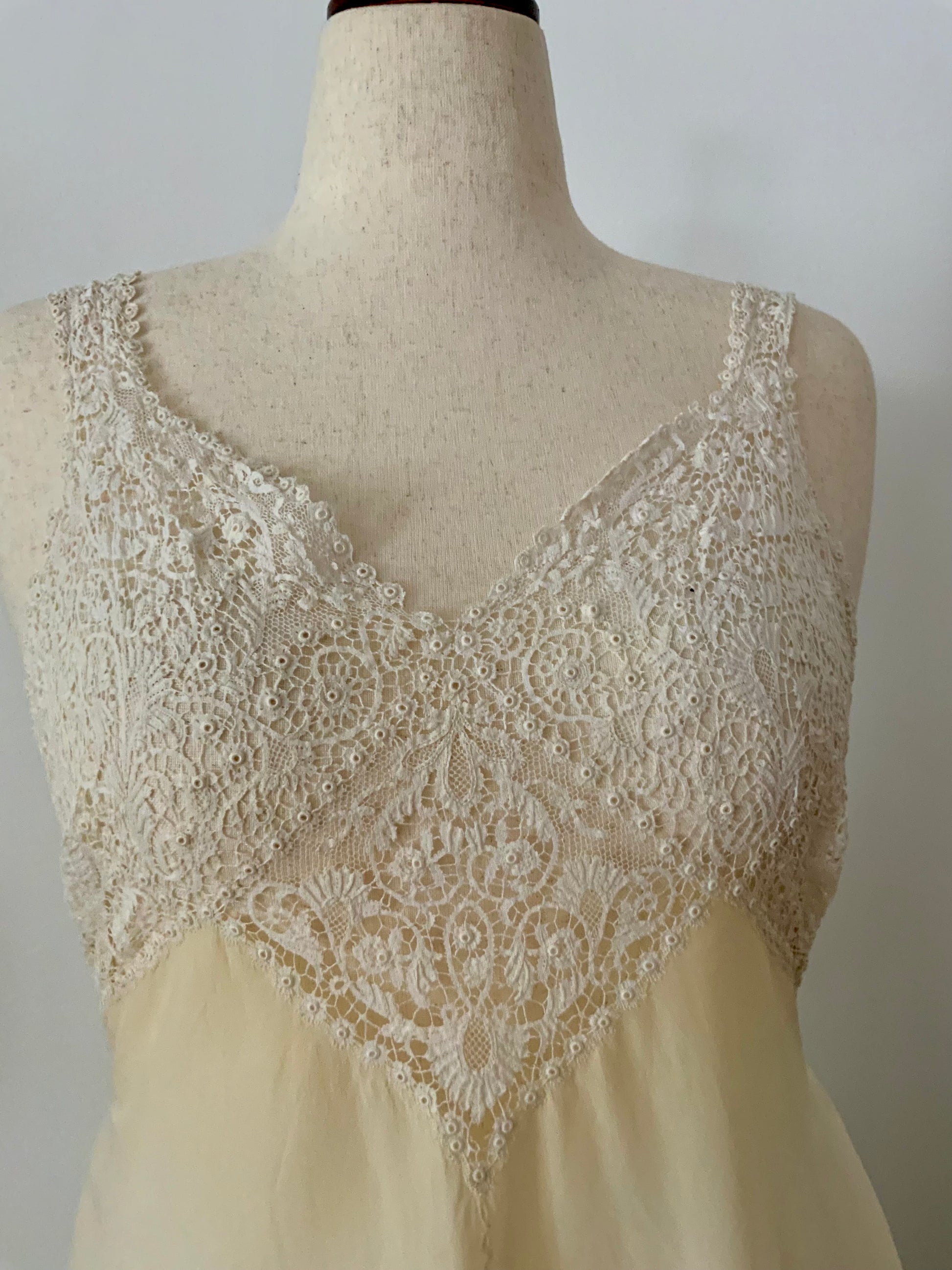 A breathtaking vintage bridal nightgown dating to the late 1930s–1940s, crafted in luminous ivory silk with an exquisitely detailed cotton lace yoke.