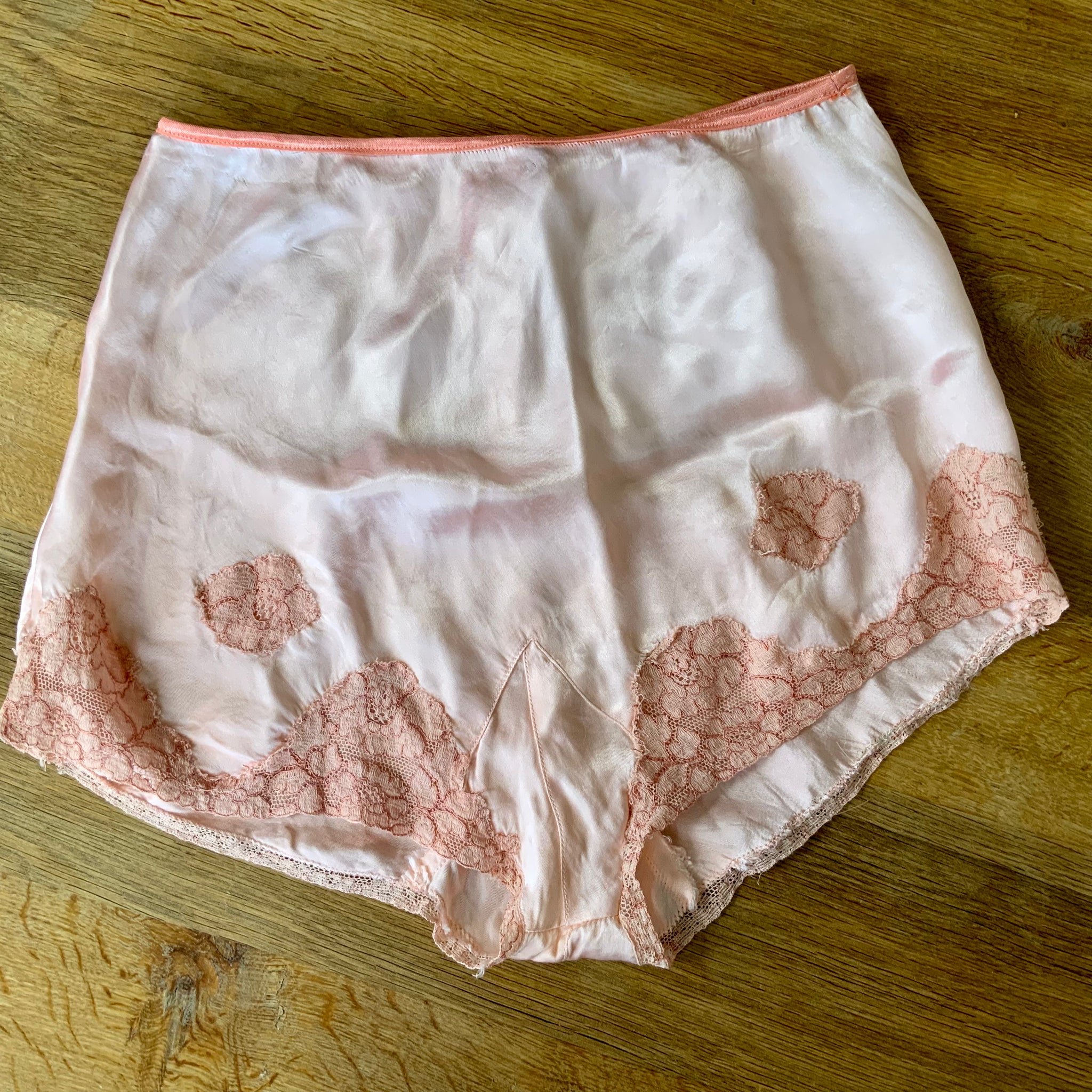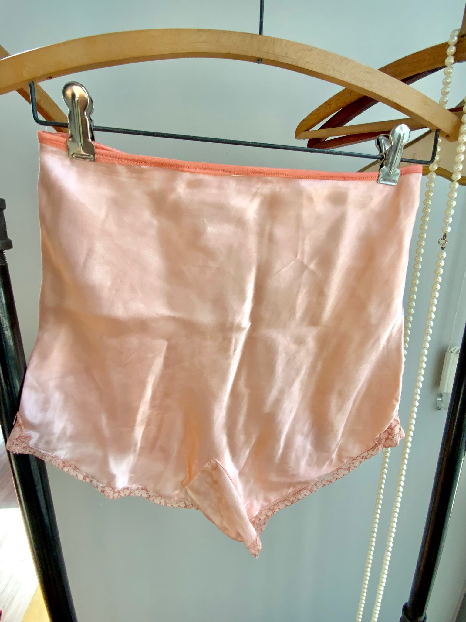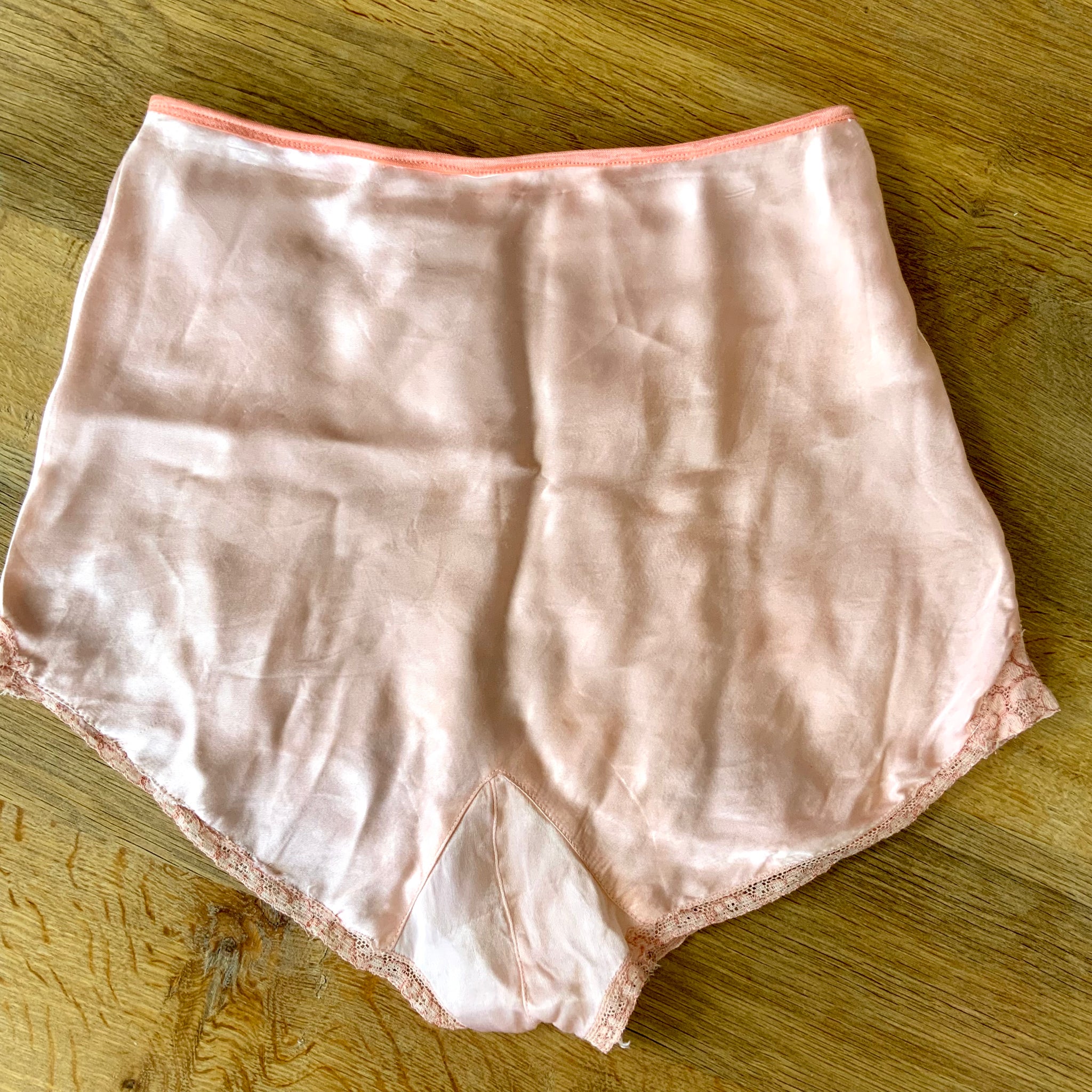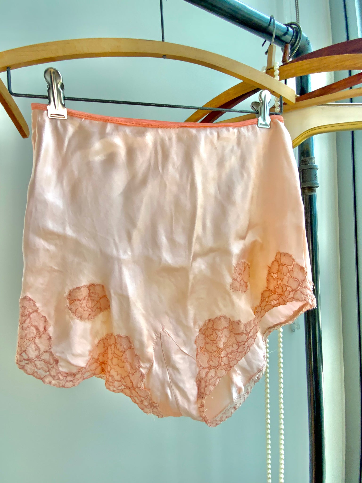 Beautiful 1940s Tap Pants. Satin. Peach. Lace embellishments. I changed the elastic in the waist because it was too stretched.