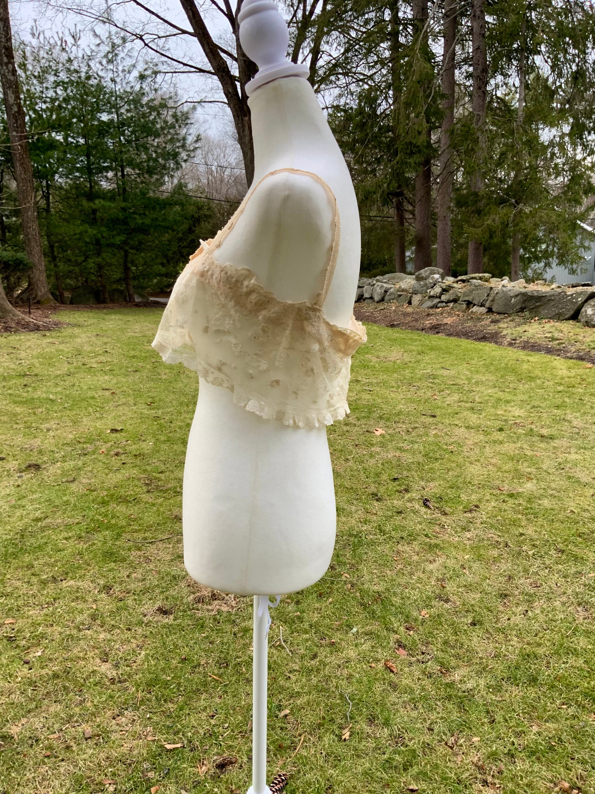 A romantic survivor of early 20th-century lingerie history, this bralette is best suited for careful wear, collection, or display, and offers a rare glimpse into the intimate craftsmanship of the Edwardian era.