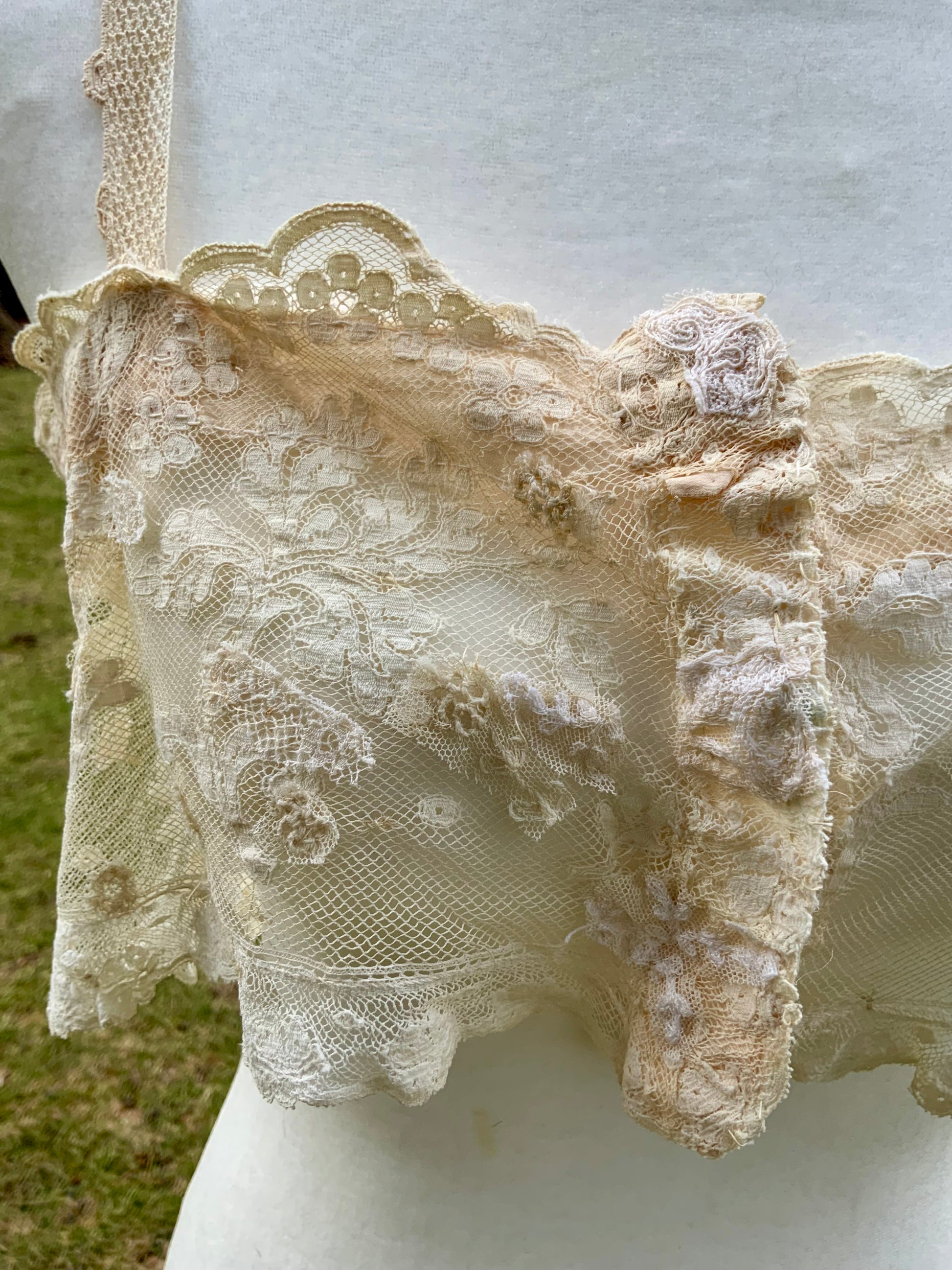 Time has left its gentle mark. Several age-related pinholes were present, consistent with the fragility of early lace. These areas have been sensitively restored using period-appropriate antique lace appliqués, carefully integrated to preserve the integrity and spirit of the original garment. The straps have been replaced to improve wearability, a common and accepted practice for antique lingerie intended for modern use.