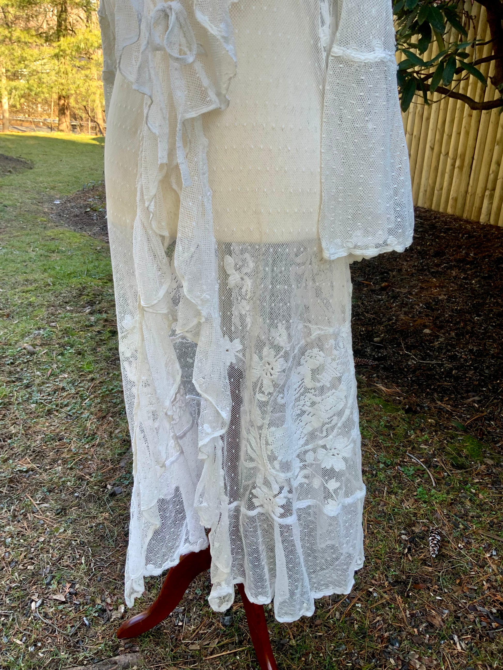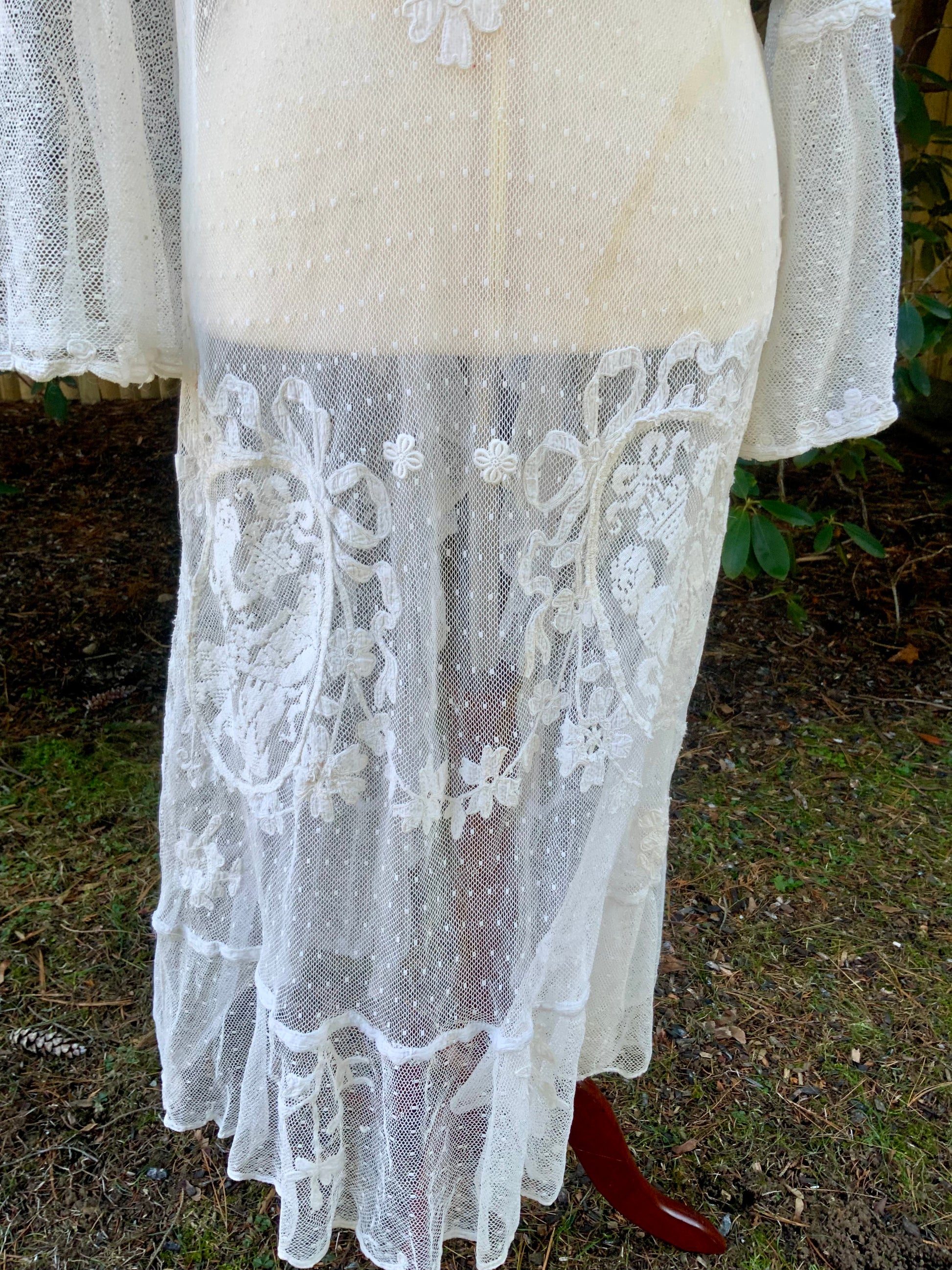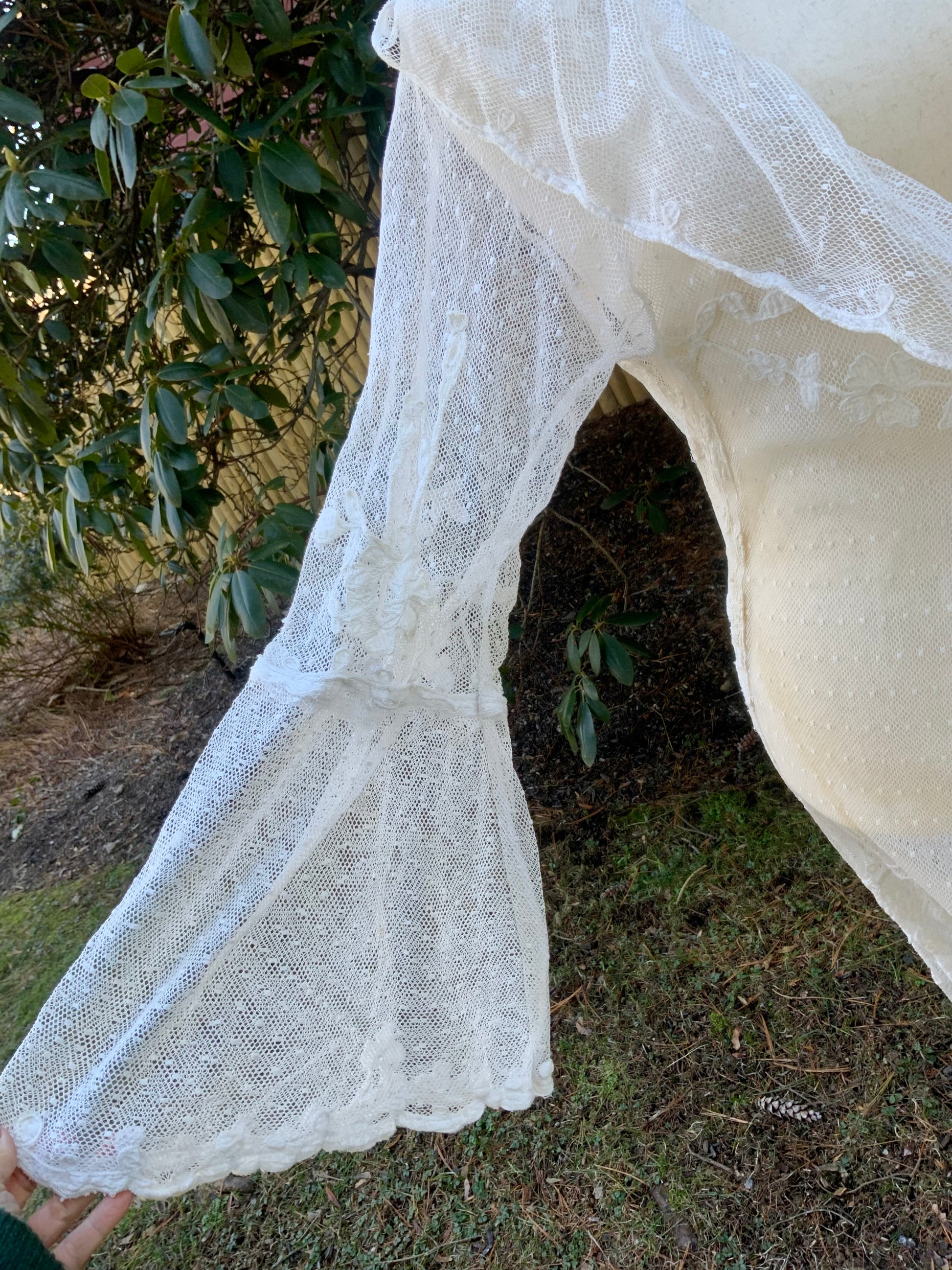 The combination of embroidered tulle and filet lace reflects the refined craftsmanship of the period and creates a soft, ethereal silhouette intended to be worn as a lingerie tunic or boudoir layer.